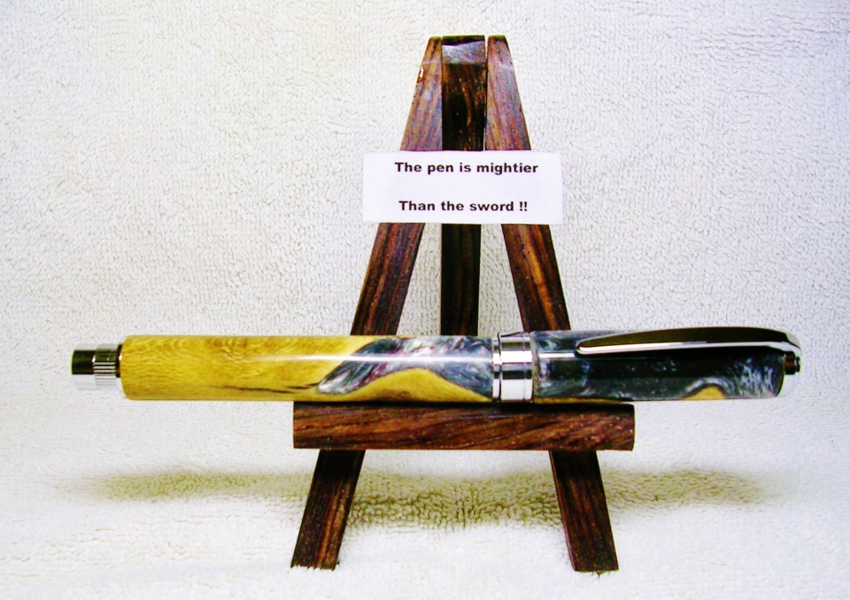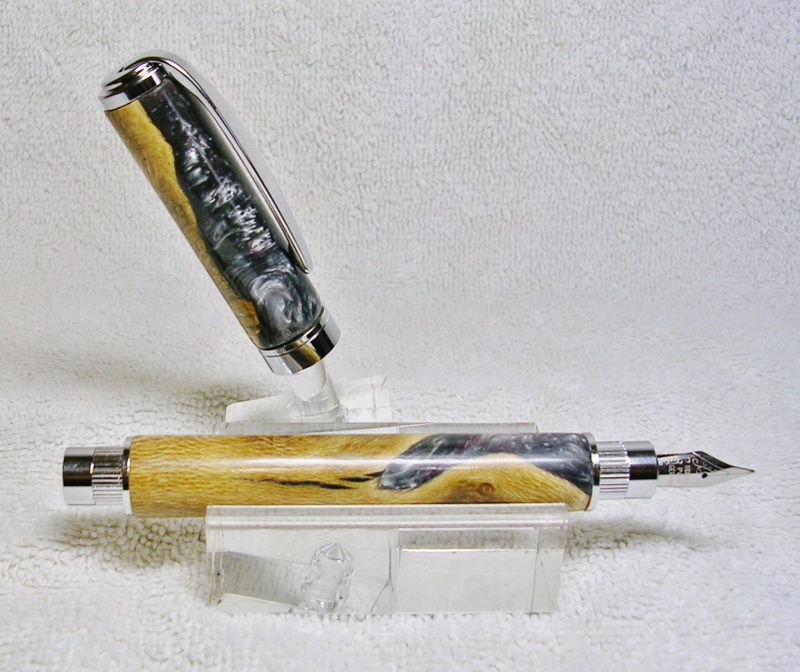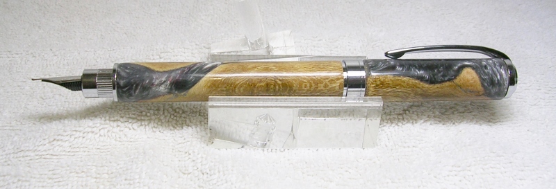This is one of the blanks that Ash (whteglve) sent me in the latest PITH exchange. The blank was scrap wood recast into a fantastic looking pen blank. The Pen kit is the PSI Magnetic Graduate Rollerball with Chrome fittings. I have lengthened the top barrel 1/2 inch to make it look more proportionate to the longer lower barrel, a 3" to 2" ratio. Sanded to 400, 8 coats of thick CA, sanded to 1200, and polished with One Step Plastic Polish. This crappy scrap wood would have been thrown away and deemed unuseabel for a pen blank if not for some outside the box thinking. Thank you Ash for the pen, case, and blanks !! Jim S