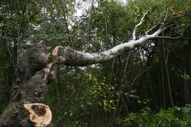 Had a couple of scary moments when instead of snapping cleanly it folded over like a noodle. Bit of rope work and some creative saw work had it down quick. The side tree stump in the fore ground is about 12 inches in diameter. I used it as a platform for cutting the main trunk.