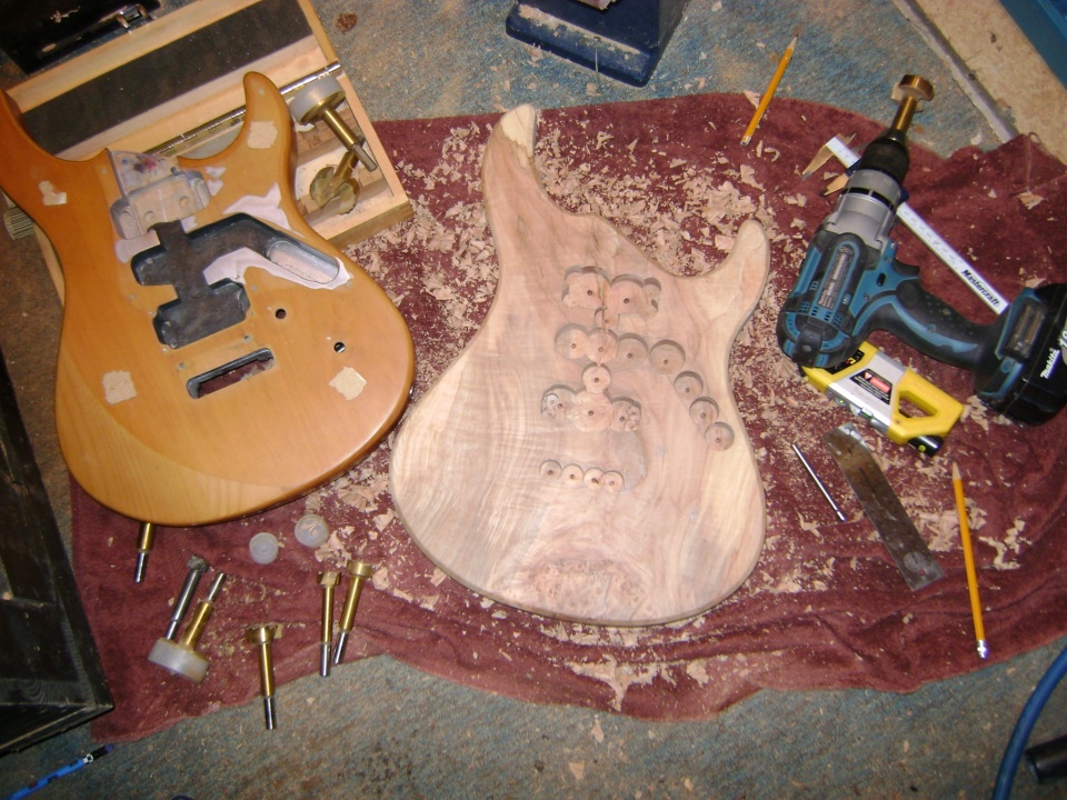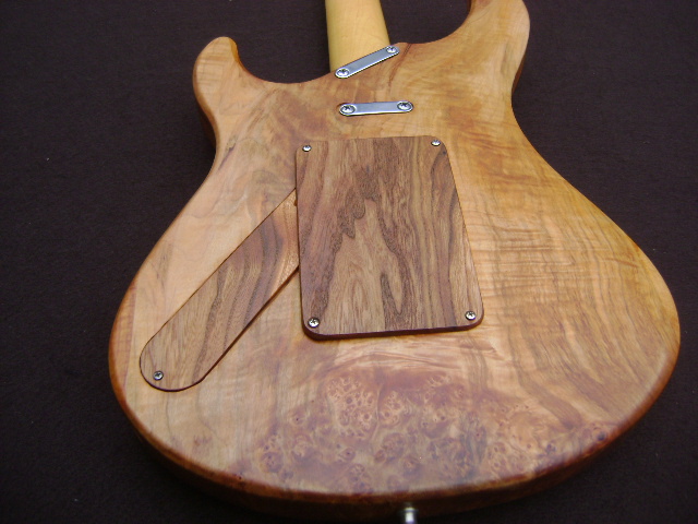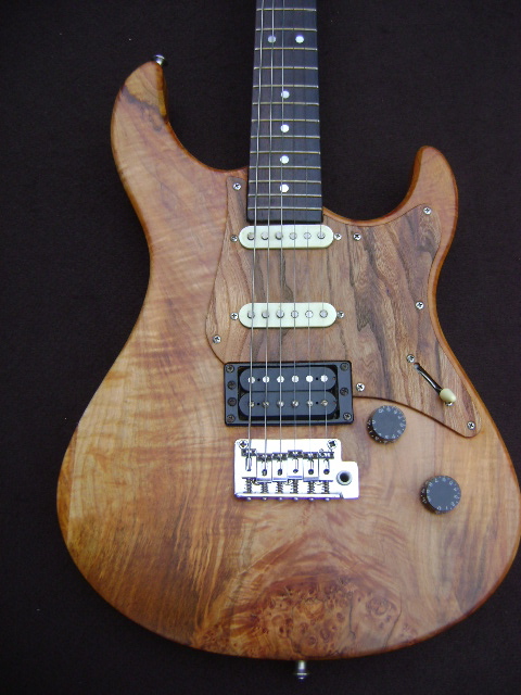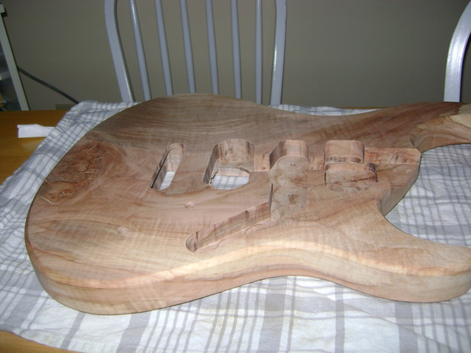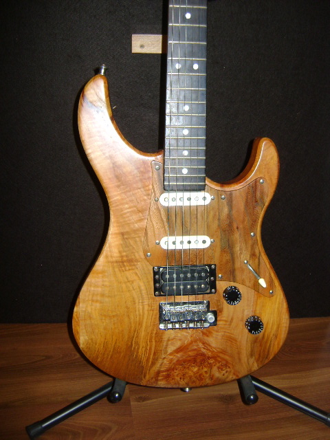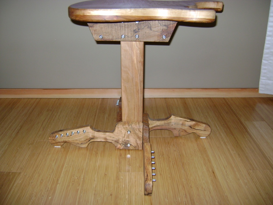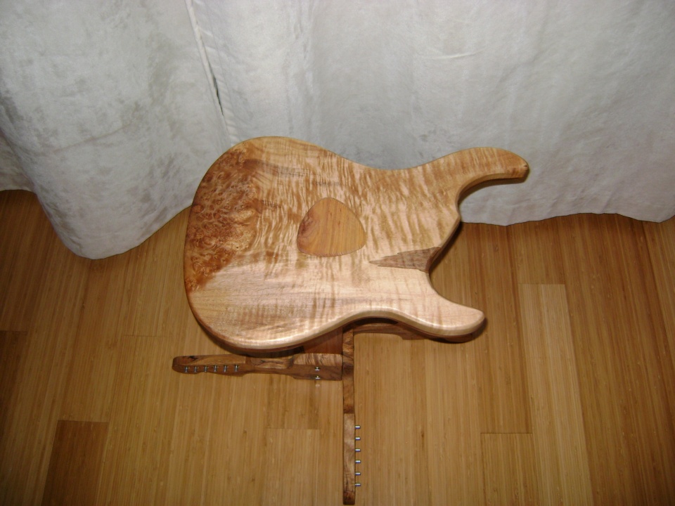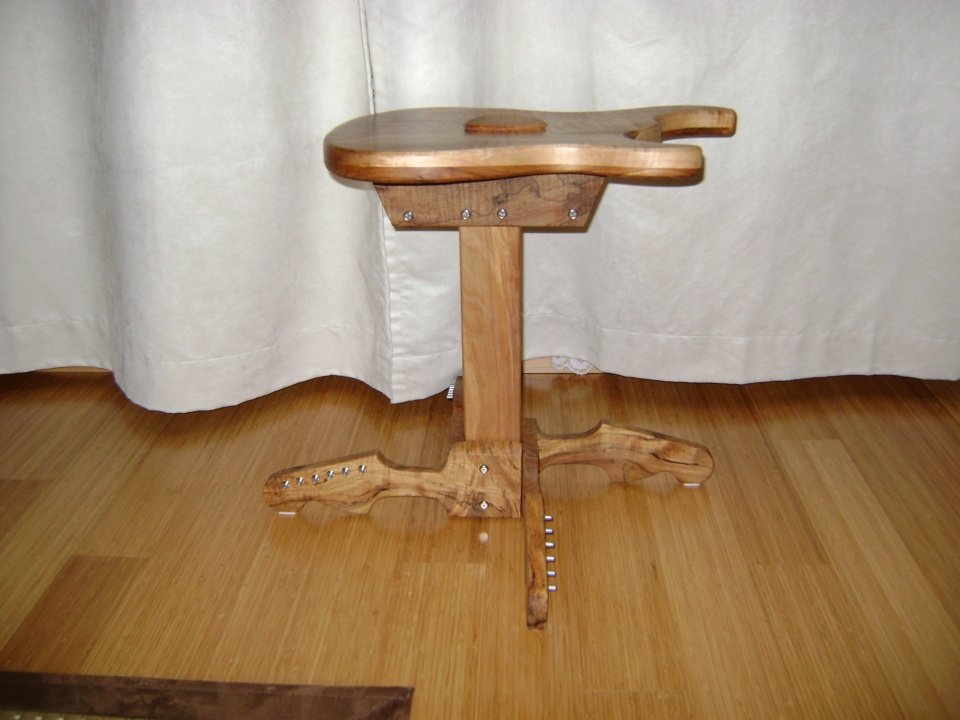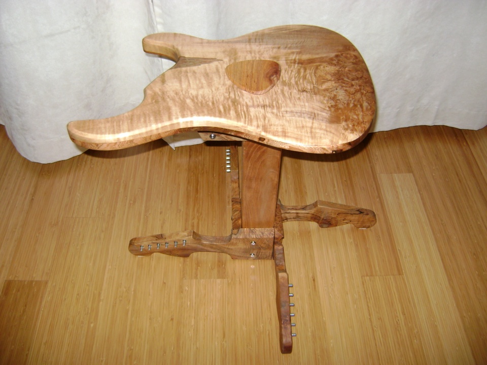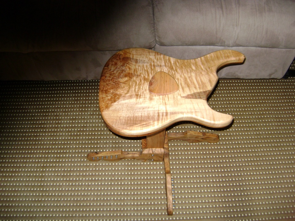 Over the years I have always been on the lookout for recycled wood for my projects. I spotted an old maple stump in one of our Parks so I cut a piece off and made 2 projects out of it. The first was a table using a Yamaha Pacifica electric guitar shape that my son owns. I laminated it with english elm that came down due to root rot. Neck legs were spalted maple, and curly maple upright. All shapes were cut on a band saw and used a home depot table belt sander to refine the shape I wanted in the guitar body and neck shaped feet. Wet sanded to 1200 grit with tung oil.