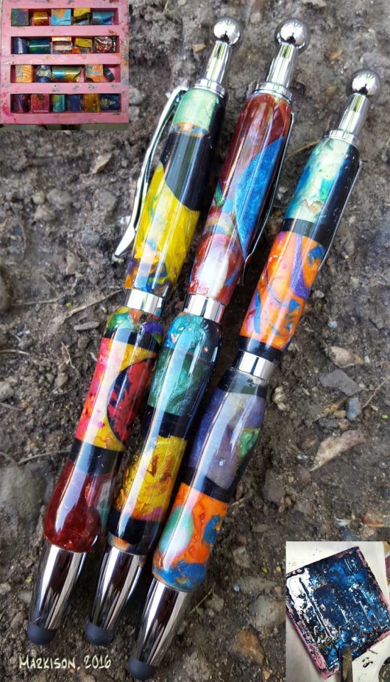 Our Bay Area earth has been fickle at times: quakes, slides, droughts, fires, etc. - so I hope this humble trio offering of recycled resin chunks in a "starry sky" magma matrix will calm her for a little while: