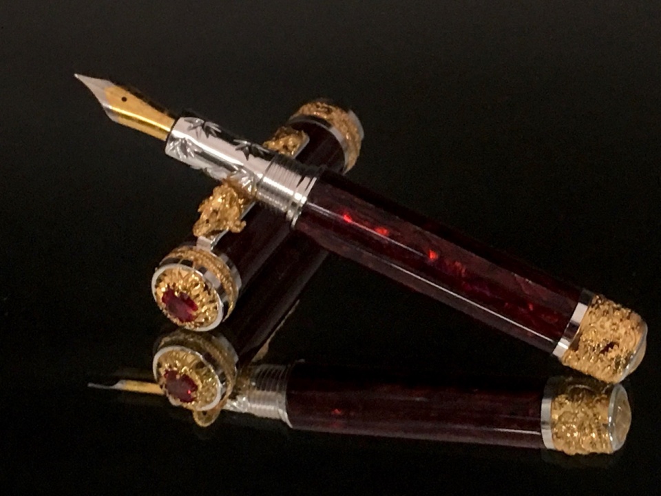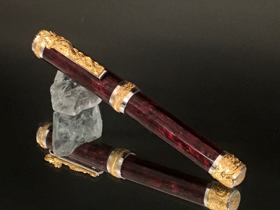 Not long ago I posted an Oriental Dragon in green abalone I made for a customer. I have now completed the "Dragon Series" with another abalone Oriental Dragon, this time in red to match the stone on the finial. I think that having the stone match the pen blank adds a lot to the overall effect of the pen. What are your thoughts? This beautiful red abalone blank was made by Signature Pen Supply (thanks, Jim & Angie!).