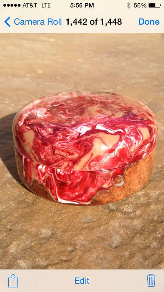 W wayneryan65 Member Joined Jan 7, 2013 Messages 104 Location Euless, Texas Apr 30, 2014 #1 Claro Walnut Burl cast with Alumilite. 3 1/2" in diameter with 10 coats of thin CA and micromesh Attachments Red Box.jpg 34.3 KB · Views: 285 Red Box3.jpg 74.4 KB · Views: 293 Red Box4.jpg 93.9 KB · Views: 258 Red Box2.jpg 76.5 KB · Views: 273