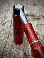 The pen has 13mm triple lead threads and sterling silver accents that are cut from sheet using a jewellers saw. The coin is cast by a company based on my own design. Nib is a Bock and it is fed by c/c. The black finials are made from acrylic.