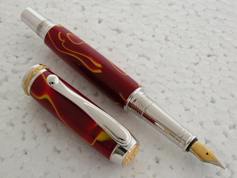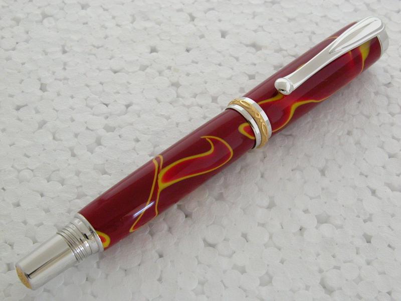 Here's a Jr. Statesman FP, red resin with yellow ribbons from exoticblanks.