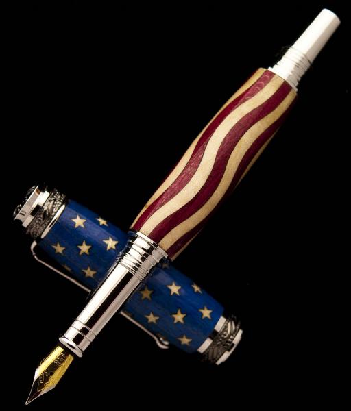 Started yesterday A.M. and finished it this A.M. It's an Flag inlay kit from Constant Laubscher on a Majestic Junior Fountain Pen. This is the second one I've done, the first was a rollerball. I'm sure others find it easy to do, but for me they are fairly tough. I got all the stars in fine and the the stripes fit great. The grain of the wood shows through in certain spots giving the inaccurate impression on the photo something is wrong with the finish. Sanded even prior to using a skew. Finished with sandpaper to 600 grit. CA (thin) X 1 coat, then CA (medium) X 7 coats, MM (wet) to 12000 grit followed by HUT Plastic Polish. Hope you like it. Comments welcome but most of all thanks for just looking. Doc