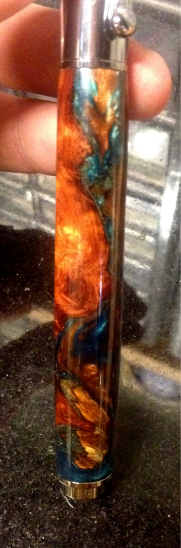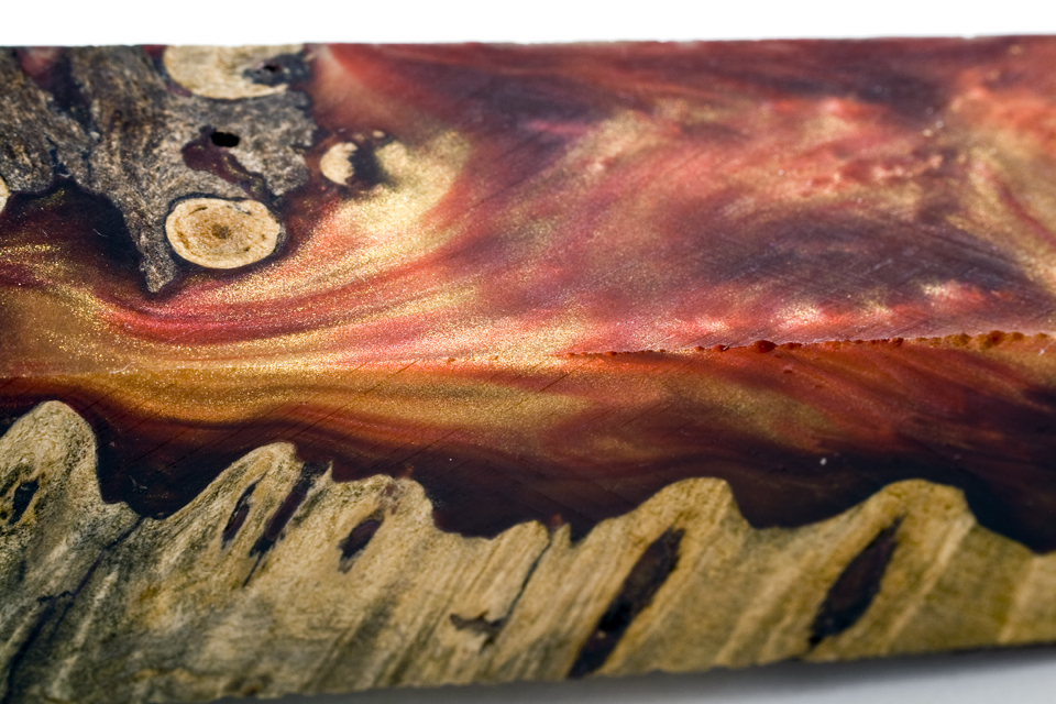 Those are almost too pretty to cut! Your photos really show how awesome those blanks are. I find myself with the same question... but would have to give black titanium a serious thought with the darker colors in that buckeye burl, yet the brightness of rhodium to go with the colored resin. I'm looking forward to seeing what you do with them. Tough decision...