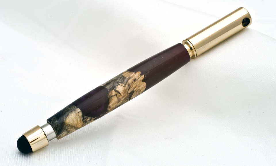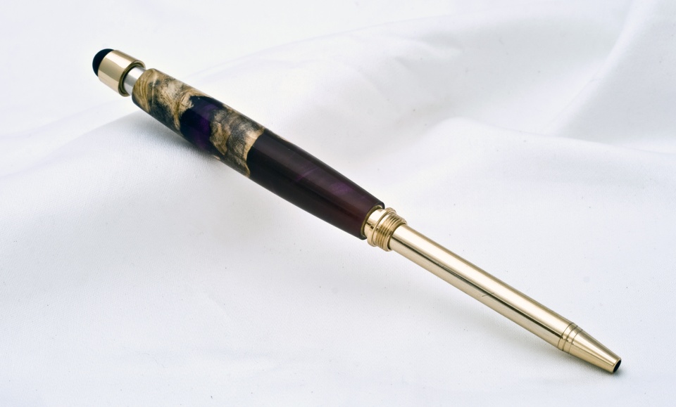 I would go with a gold finish for the red and black or rhodium for the purple. How deep does the resin go into the blank. Does the resin diminish as you go towards the center of the blank? If so, then keep to the bigger kits. It would be a shame to turn it for a smaller diameter kit and lose the effect of the resin.