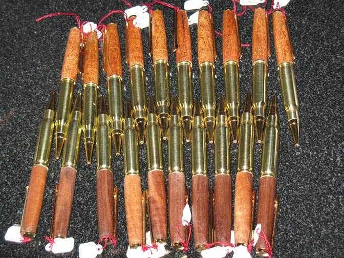 These are made from the same casings as I sell here. My best sellers are 308's -- brass with just a local or plain wood. 10 of these are Mesquite and the rest are Walnut. I was sold out and had to restock.