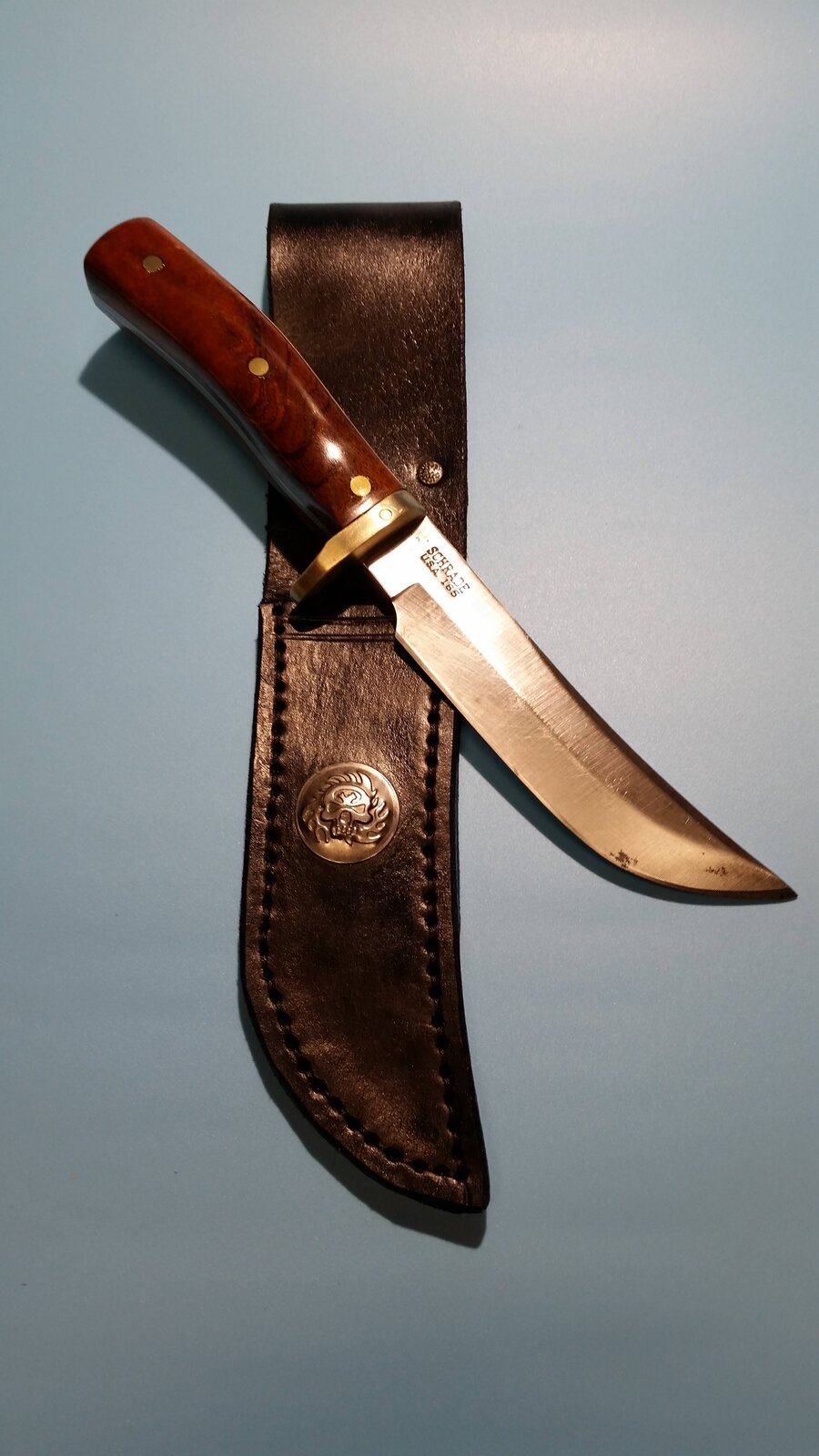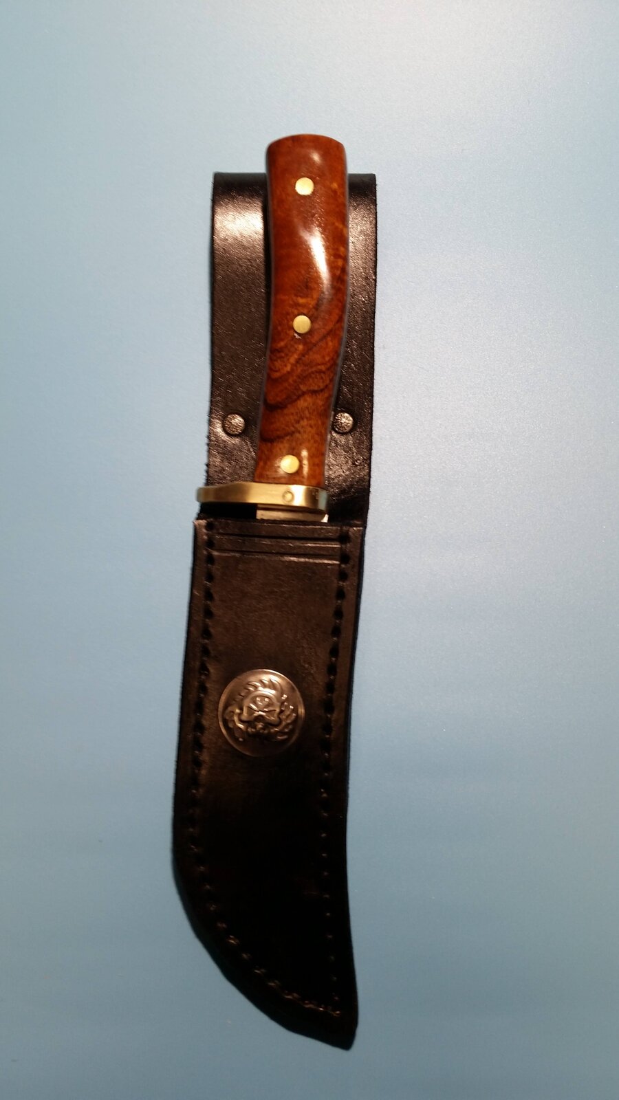 Every once in awhile I'll have someone ask me to restore an old knife. Usually all I have to do is replace the handle and most are very easy. Some restoration work I've been asked to do is on knives that are very old or old family gifts that someone's neglected for some time. The worst restoration I've ever done was on a knife that went through the Carr fire in Redding CA. It was, first off, a hidden tang knife that was twisted, bent down and bent to one side and was very brittle. These two here were much easier but the Tanto was a bit of a challenge as I couldn't remove the pommel and the hidden tang had to be done in two pieces. The wood is Koa. The medallion on the skinner is an upper skull with flames behind it. The person who asked for the work is a big time biker (not a Wild Hog biker but more like the Del Fuegos, but a supper nice guy). These knives were knives he had when he was young and just recently found them again. Thanks for looking.