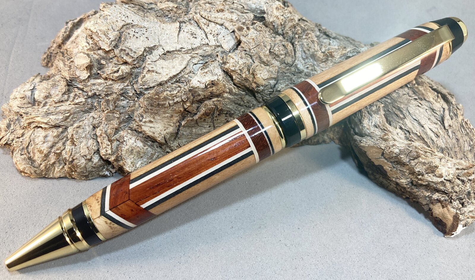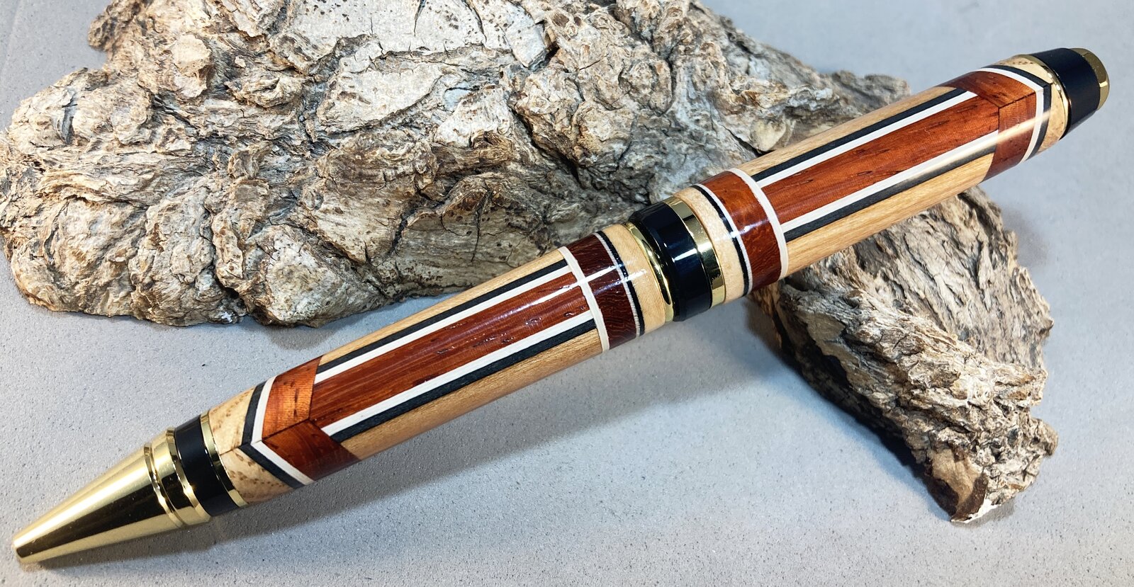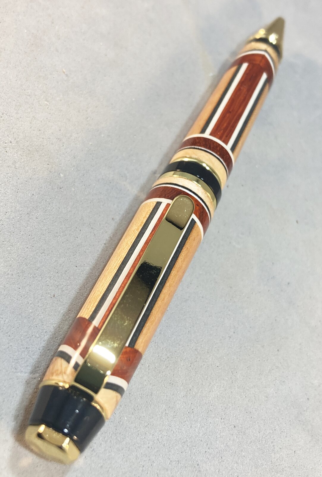 Here's my first pen using Mark James' materials (Padauk, Beech (I think), and oak, with Vulcanized Paperboard dividers).