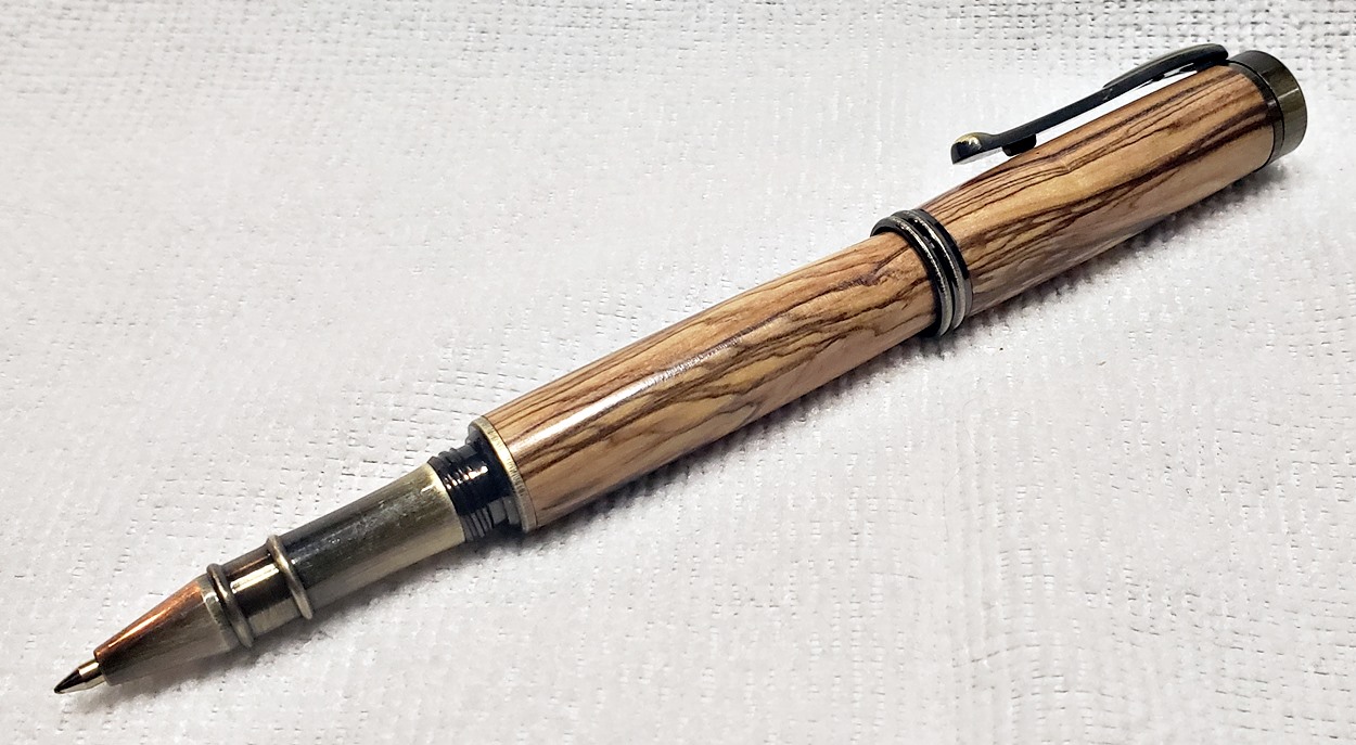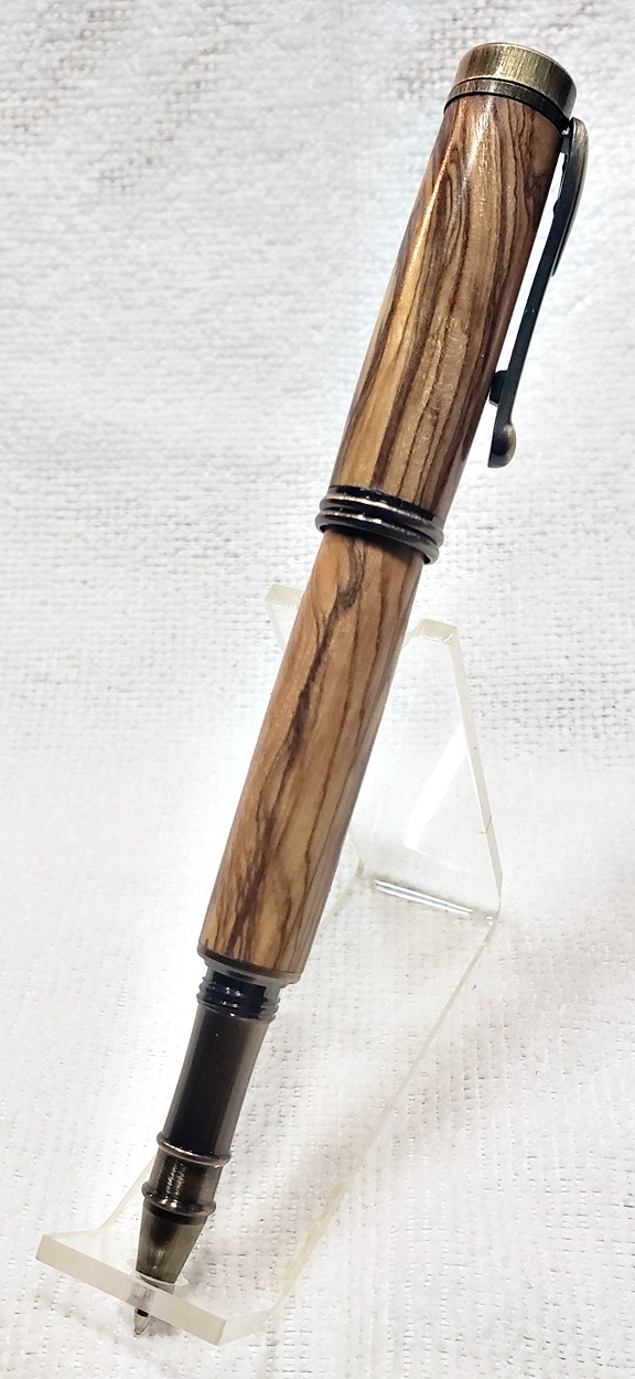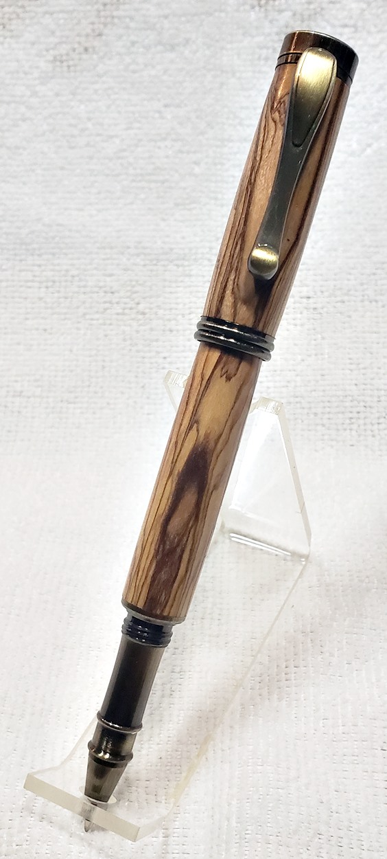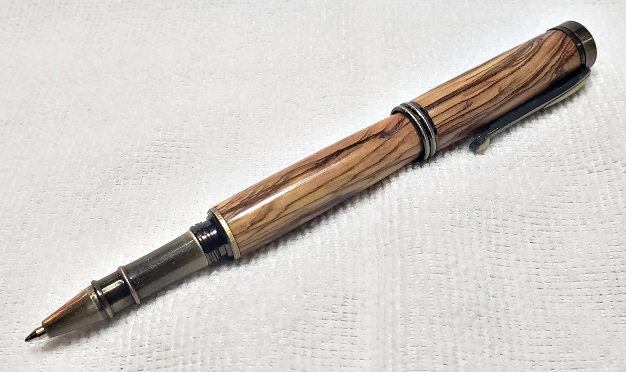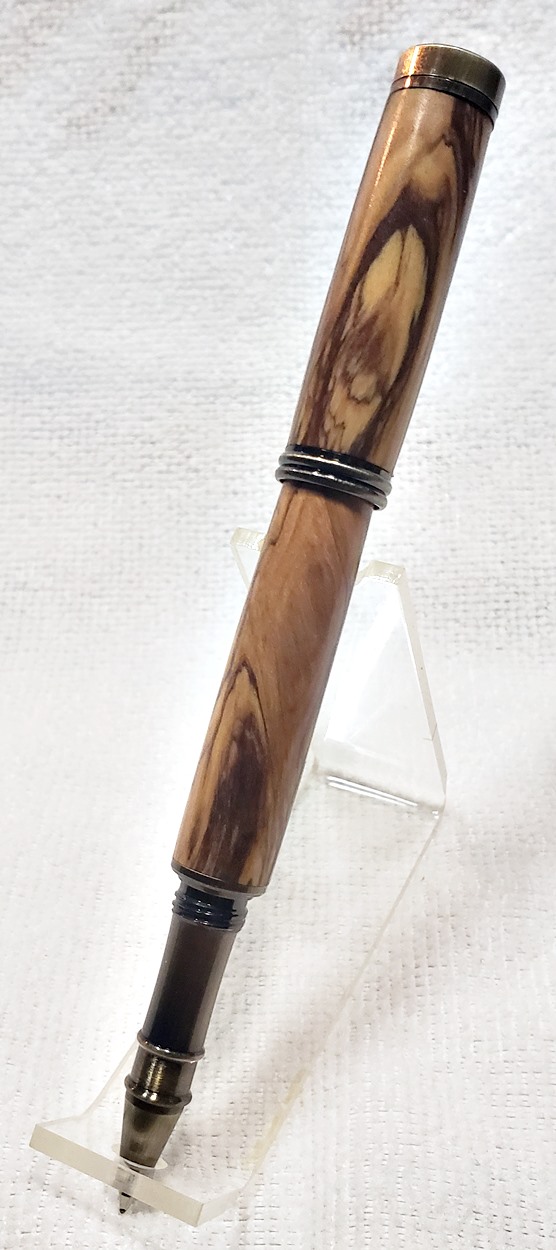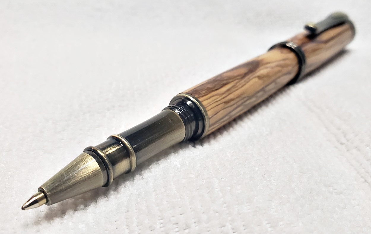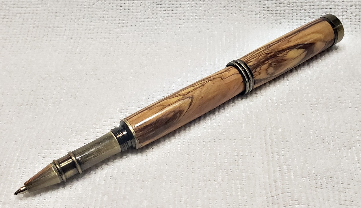 I really like this pen! It's called a Retro Rollerball, and is my first. It's from Rockler, and is relatively inexpensive at only $12. It's only available in the one finish, unfortunately, which is antique bronze. I think it would also look good in antique pewter. Regardless, I love it. It looks great with the olivewood blank. The finish is Pens Plus.