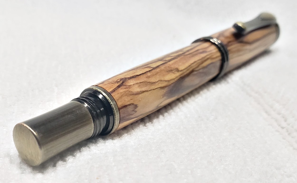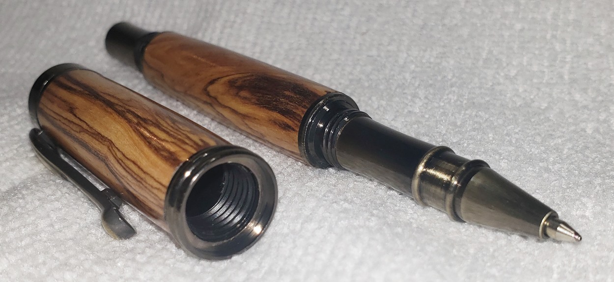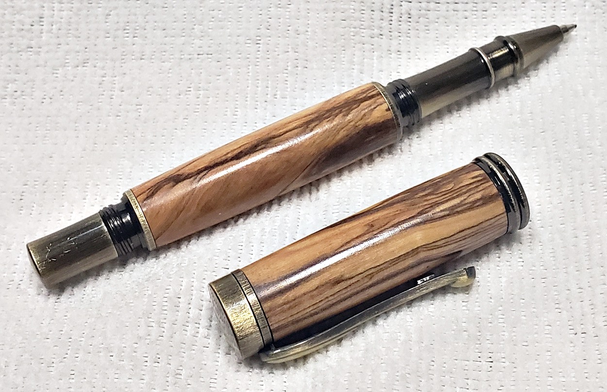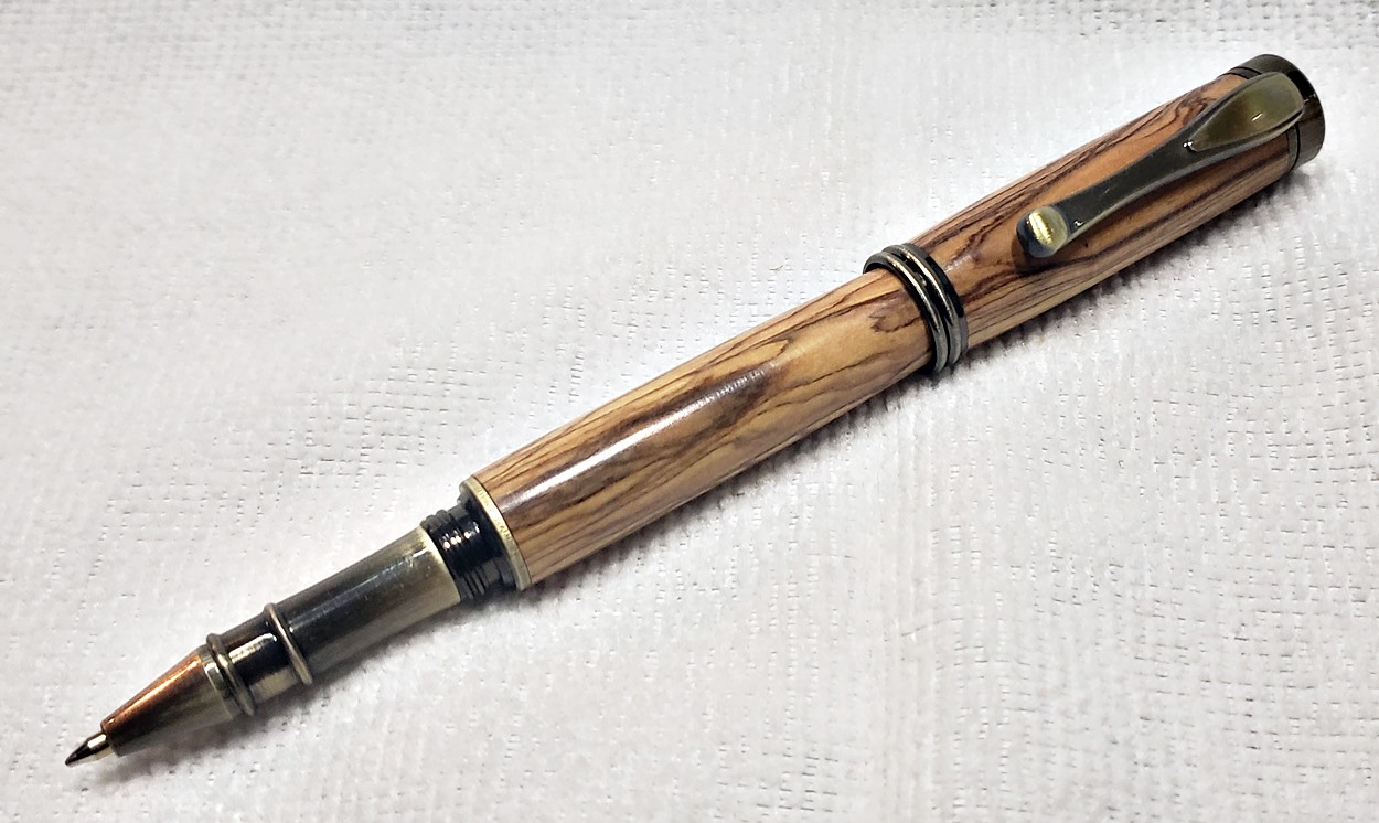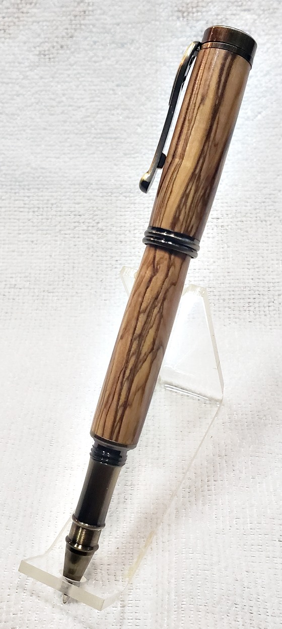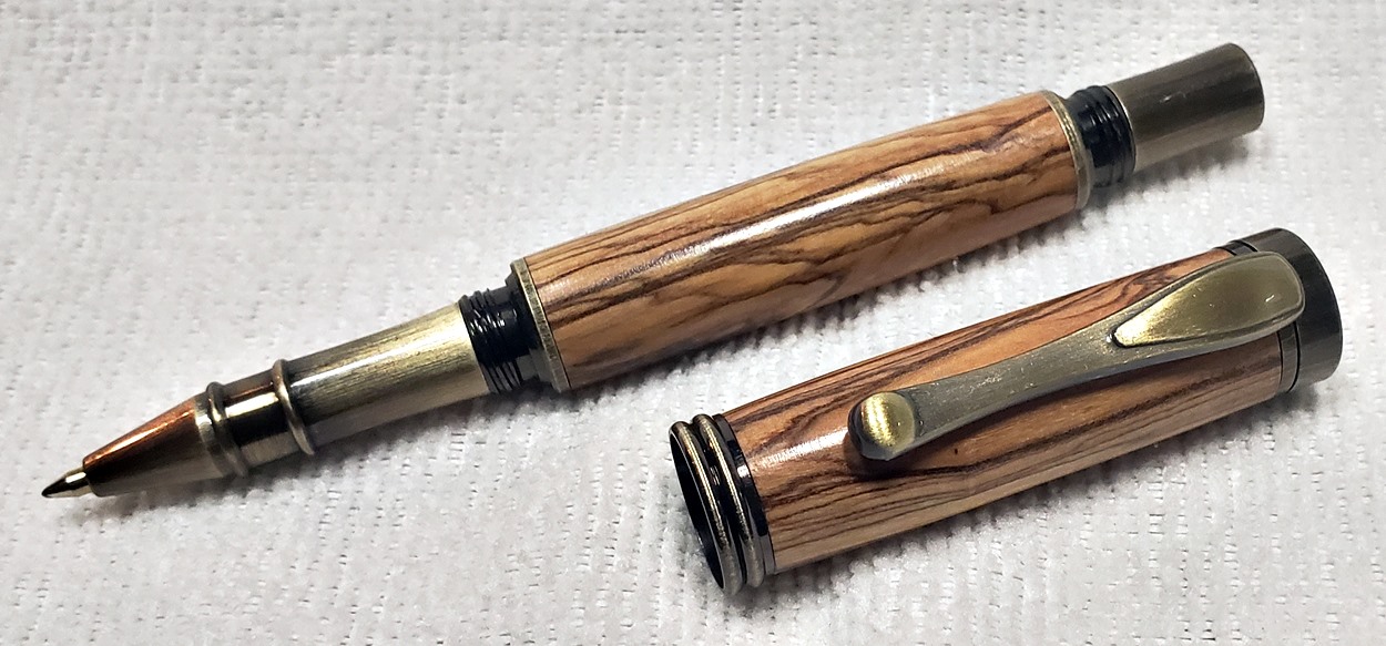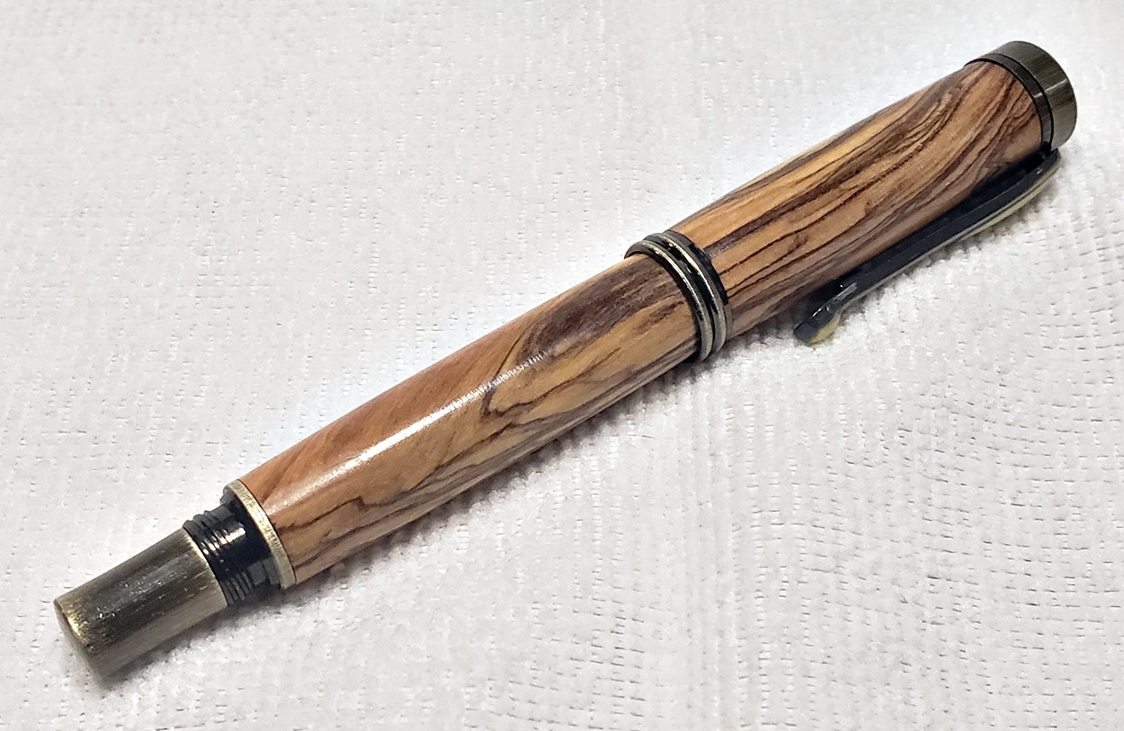 I really like this pen! It's called a Retro Rollerball, and is my first. It's from Rockler, and is relatively inexpensive at only $12. It's only available in the one finish, unfortunately, which is antique bronze. I think it would also look good in antique pewter. Regardless, I love it. It looks great with the olivewood blank. The finish is Pens Plus.