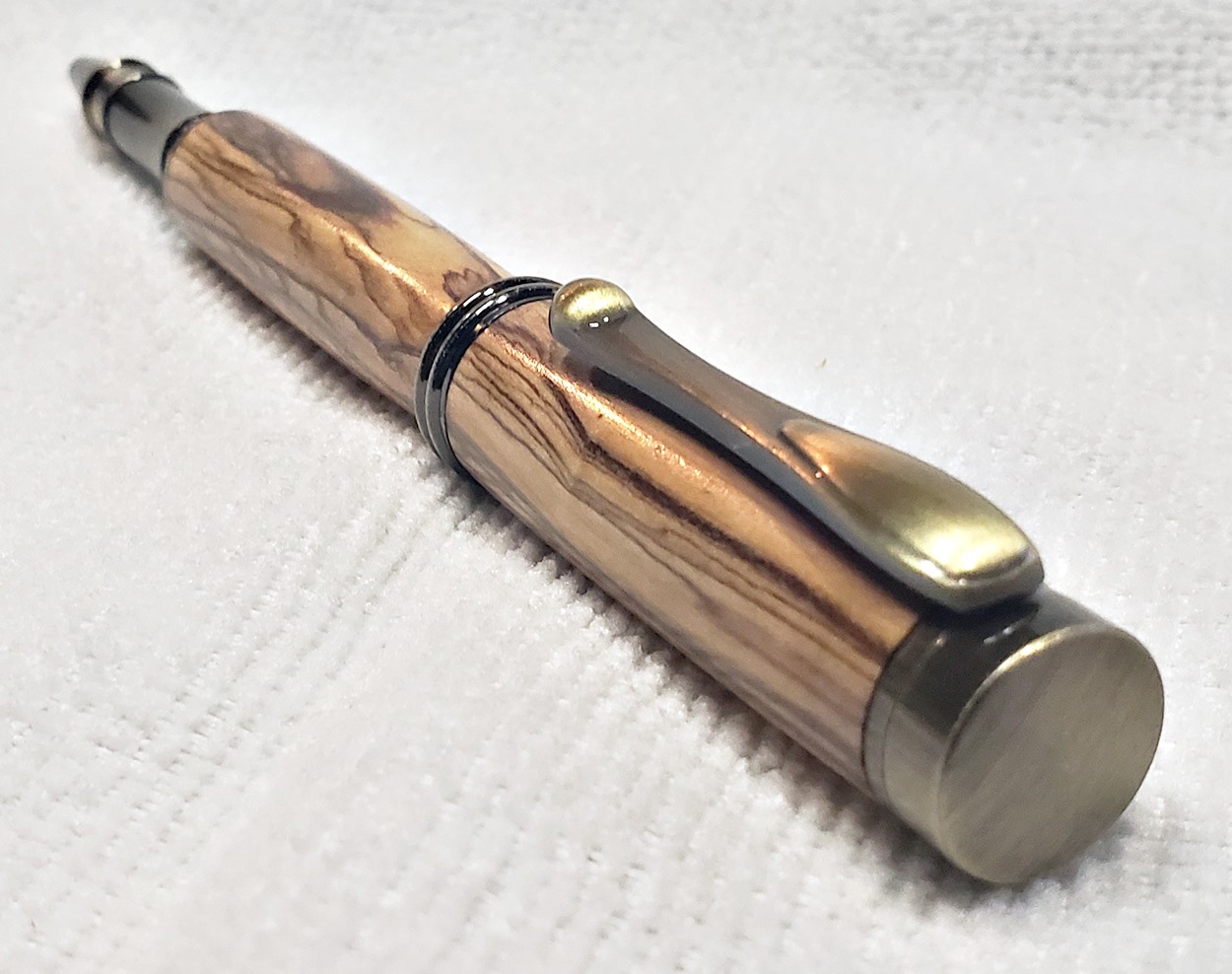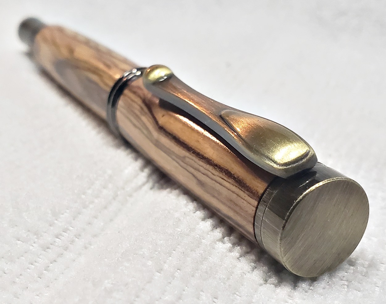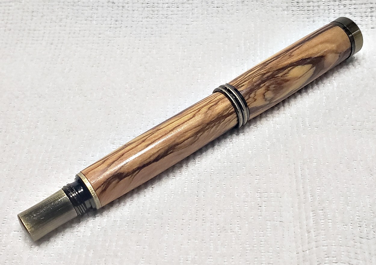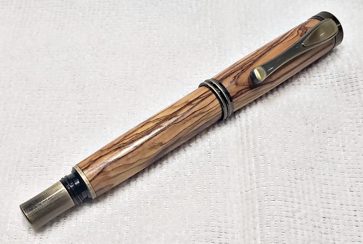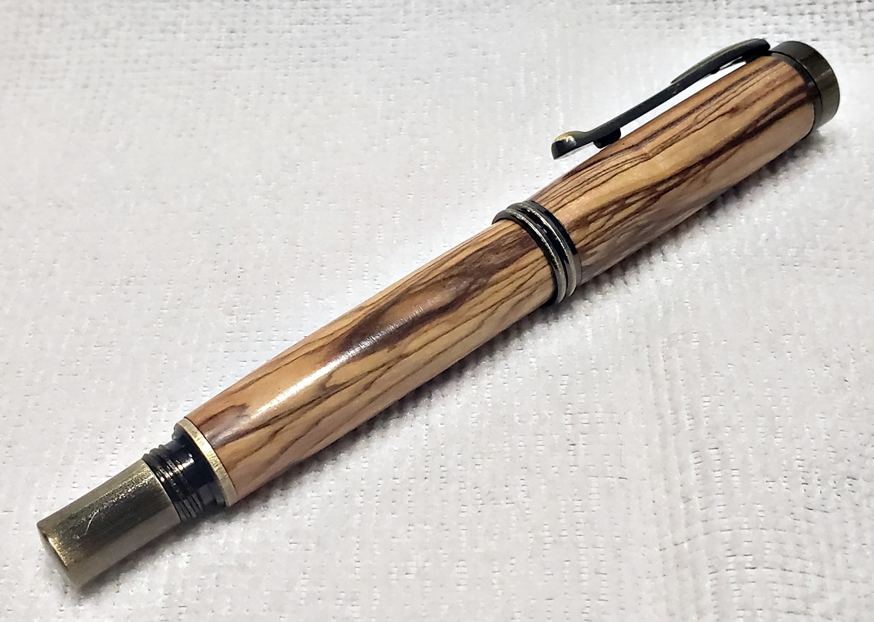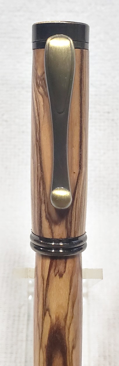 I really like this pen! It's called a Retro Rollerball, and is my first. It's from Rockler, and is relatively inexpensive at only $12. It's only available in the one finish, unfortunately, which is antique bronze. I think it would also look good in antique pewter. Regardless, I love it. It looks great with the olivewood blank. The finish is Pens Plus.