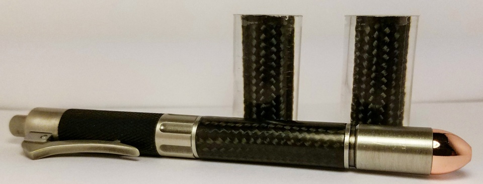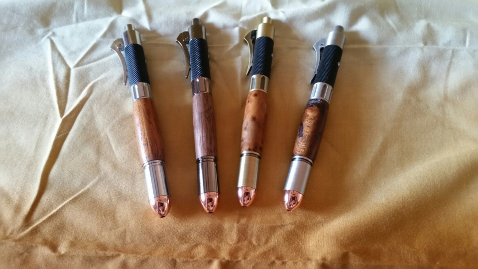 From left to right they are Chrome/Brazilian Cherry, Gun Metal/Walnut, Brass/Thuya Burl, and Pewter/Mesquite.