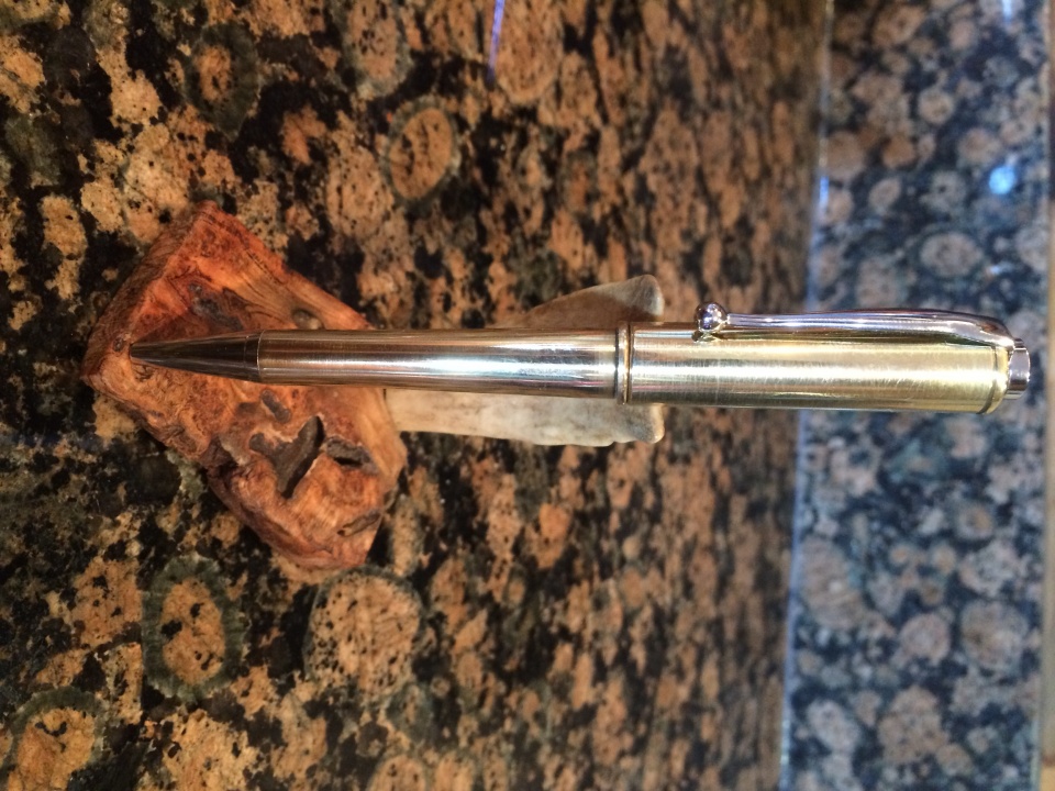 Here's my latest cartidge pen. It's on a PSI slimline kit. I turned all of the spacers between the tubes and the cases from deer antler. It's also the first time I turned the rim off a brass case. The upper is a 45-70 Govt and the lowers is from a 32-40 Ballard. It's an unusual caliber as it tapers the entire length of the brass. I am really happy with the lines that produces. I have one more case of that caliber to play with.