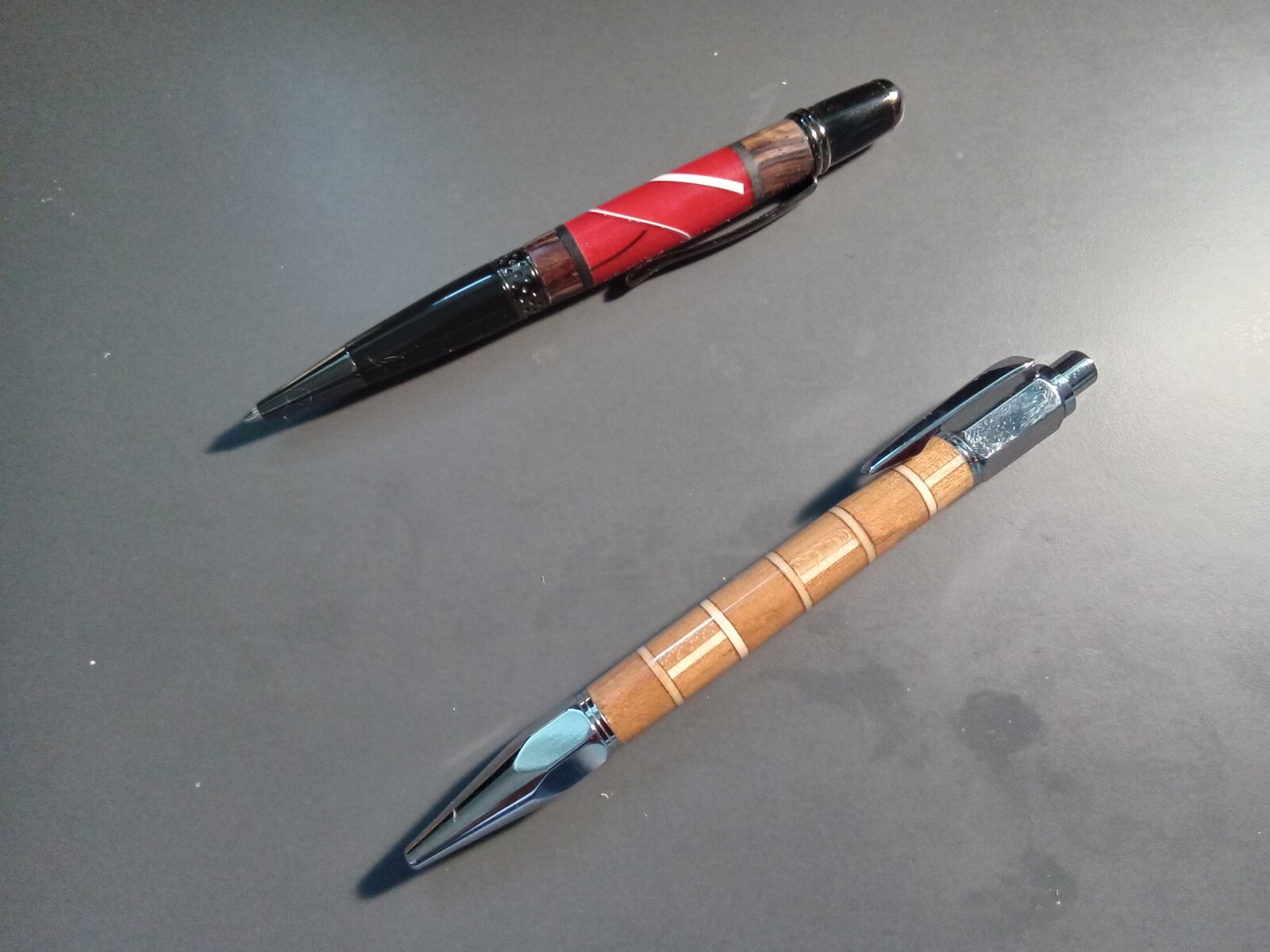 More to add to my "Rock Gods" collection. For Pink Floyd a Vertex "Wall" pen with hickory bricks and birch mortar. For the late, great King Edward a Mesa "Frankenstat" design with cocobolo (kinda reminds me of the Diver Down album cover ftom Van Halen, too).