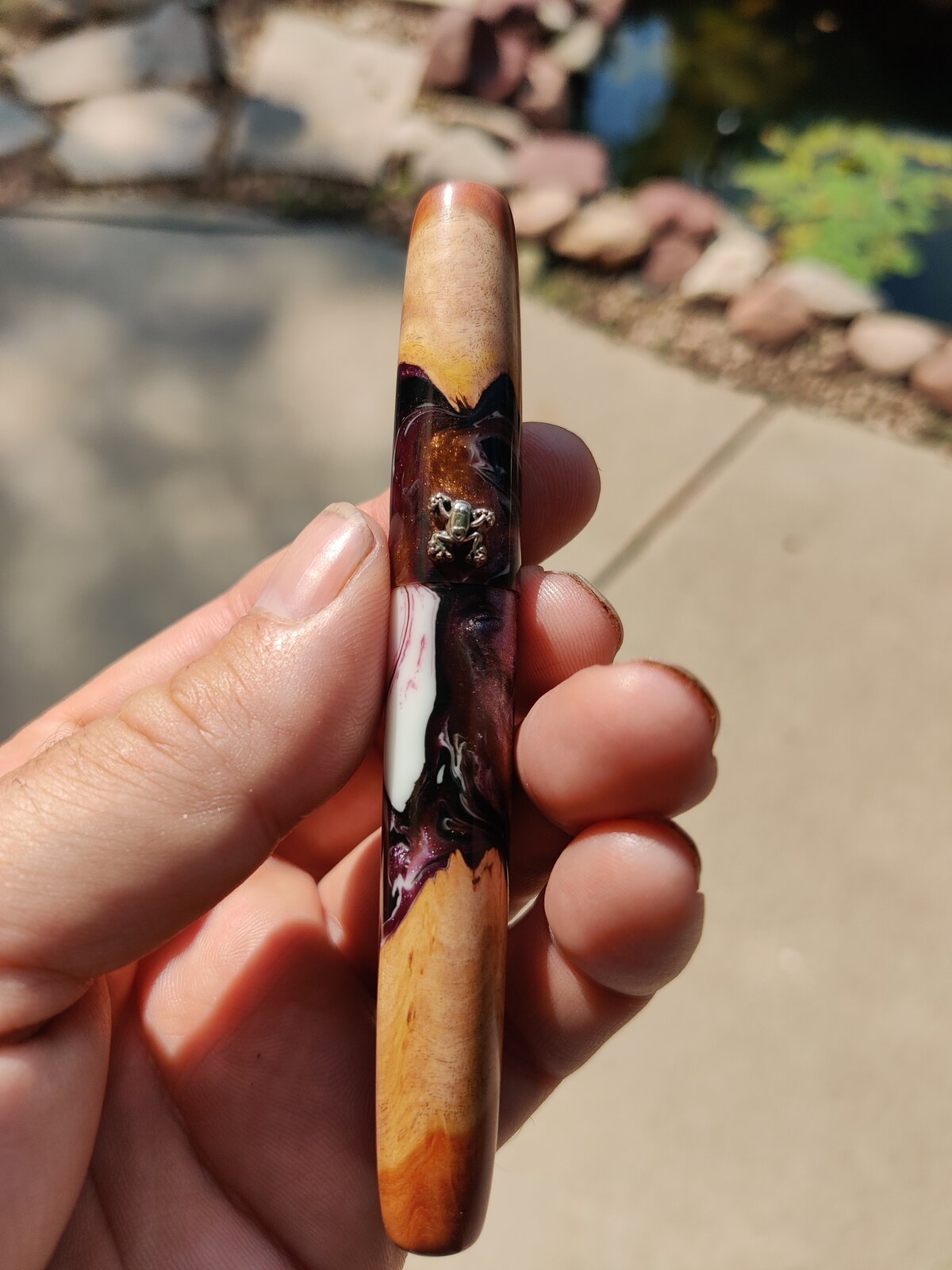 It is some type of charm that I drilled a place in the back of for a post that I then drilled a hole for in the cap and glued in. I also reemed out the back of the charm to fit the curve of the cap better as well.Interesting. It looks like it's embedded in a worth wood blank. Did you cast it or drill out a place for it?