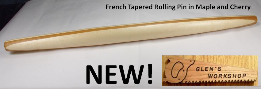 French tapered rolling pin in Maple and Cherry. 22 inches long with 1 1/2 inch main diameter and 7/8 inch at the ends. The flat area is about 8 inches. Sanded to 600 Abranet and finished with clear Danish Oil.