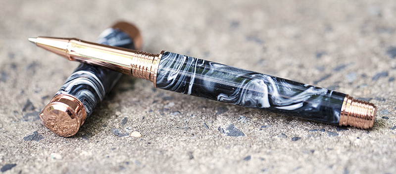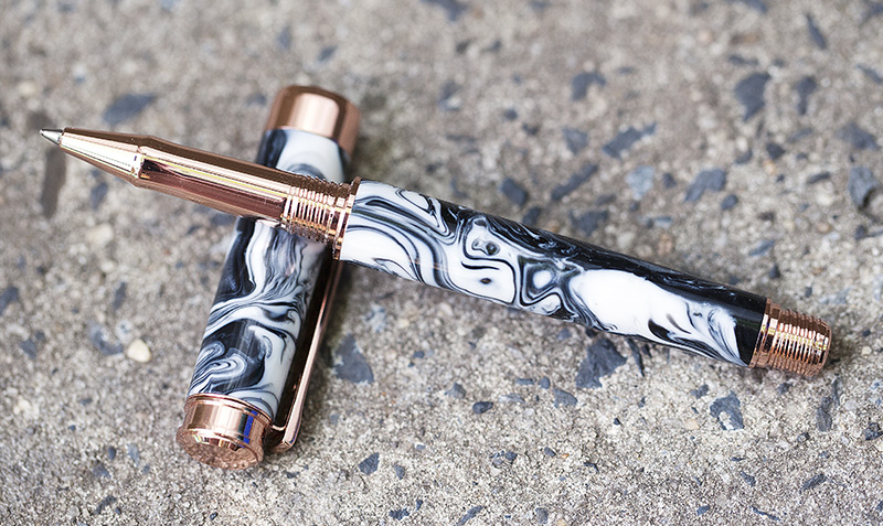 I bought this kit a while ago but struggled to find a blank that would complement the rose gold. Yesterday I finally checked color harmonies for rose gold, black, white, and grey were some of the possible colors, so I dug up a blank I made a while ago and voilà