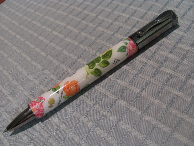 I finished up yet another Zen stamp pen this morning.I used these really pretty Royal National Rose Society stamps from Great Britain.I like these because the feature a gold silhouette portrait of the Queen on them,I think it adds a classy touch to a ladies pen.I think the yellow rose really makes it pop.