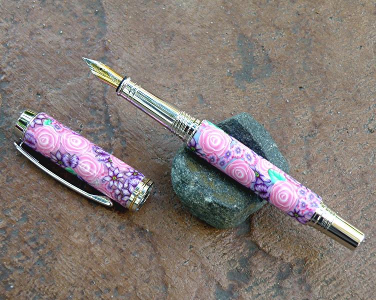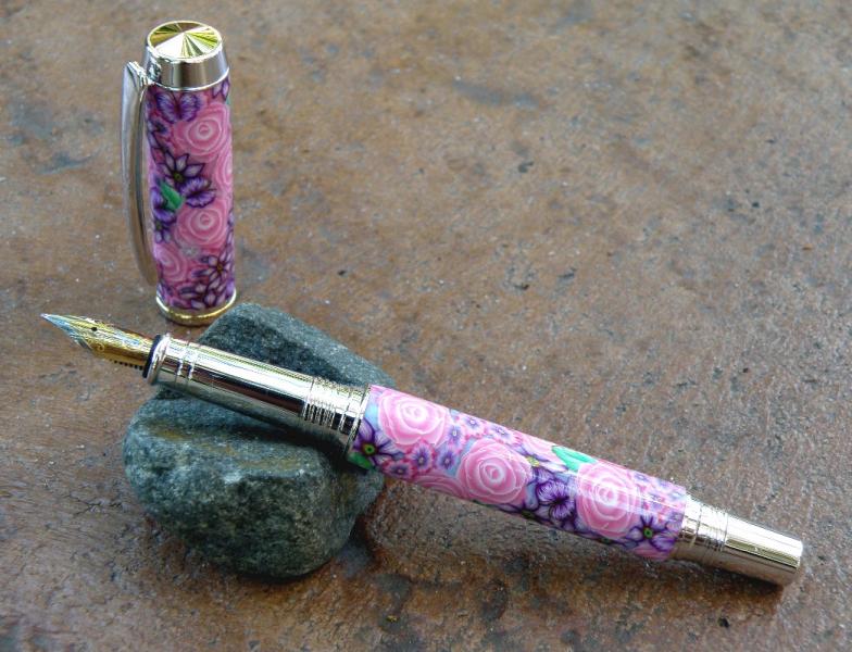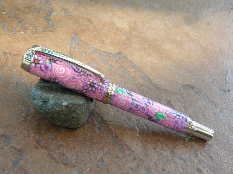 The polymer clay pink flower FP is one I got from Toni. Placed on a Jr. Gent with a replaced nib and finished with CA.