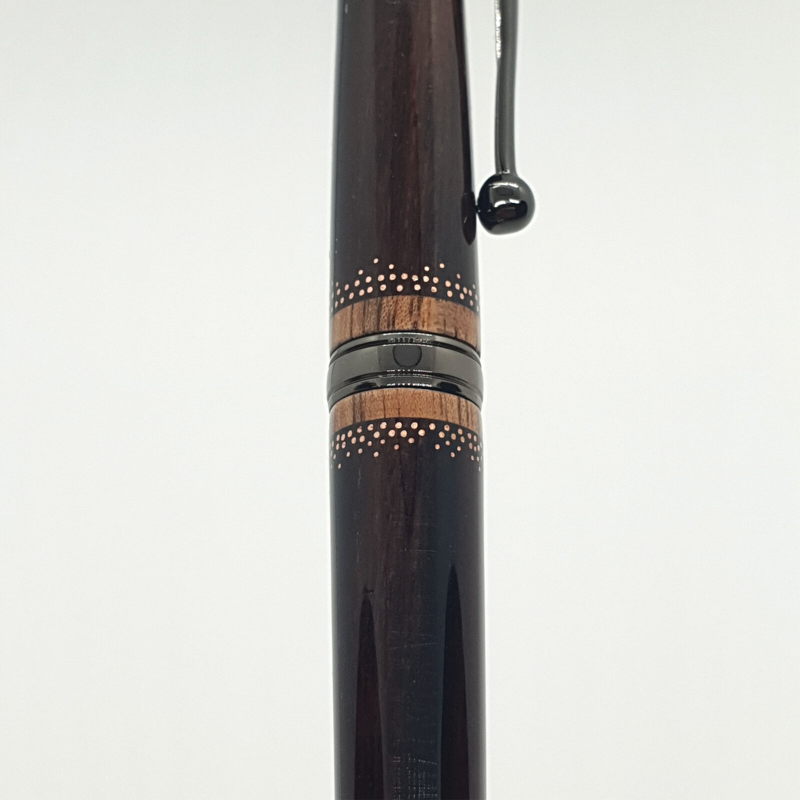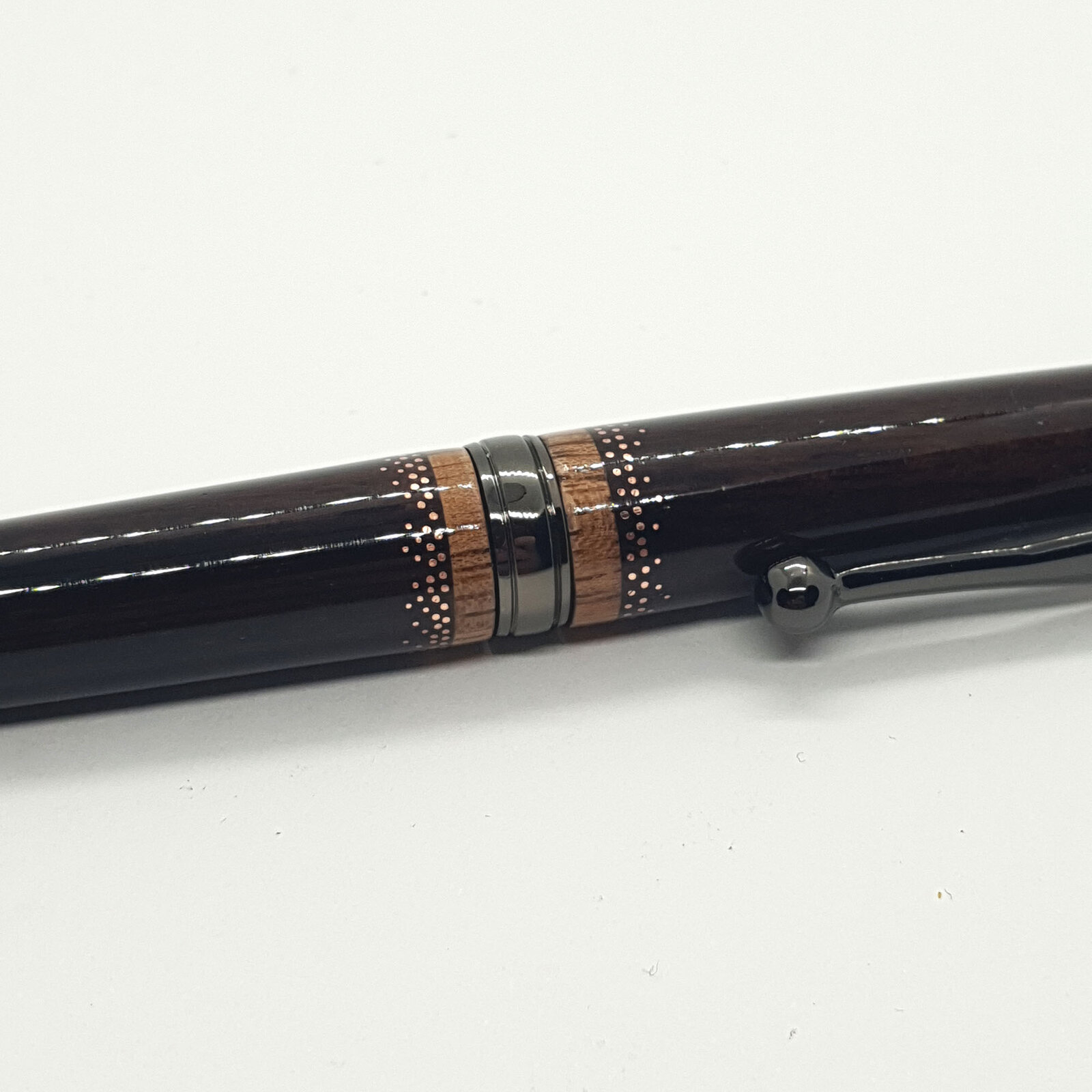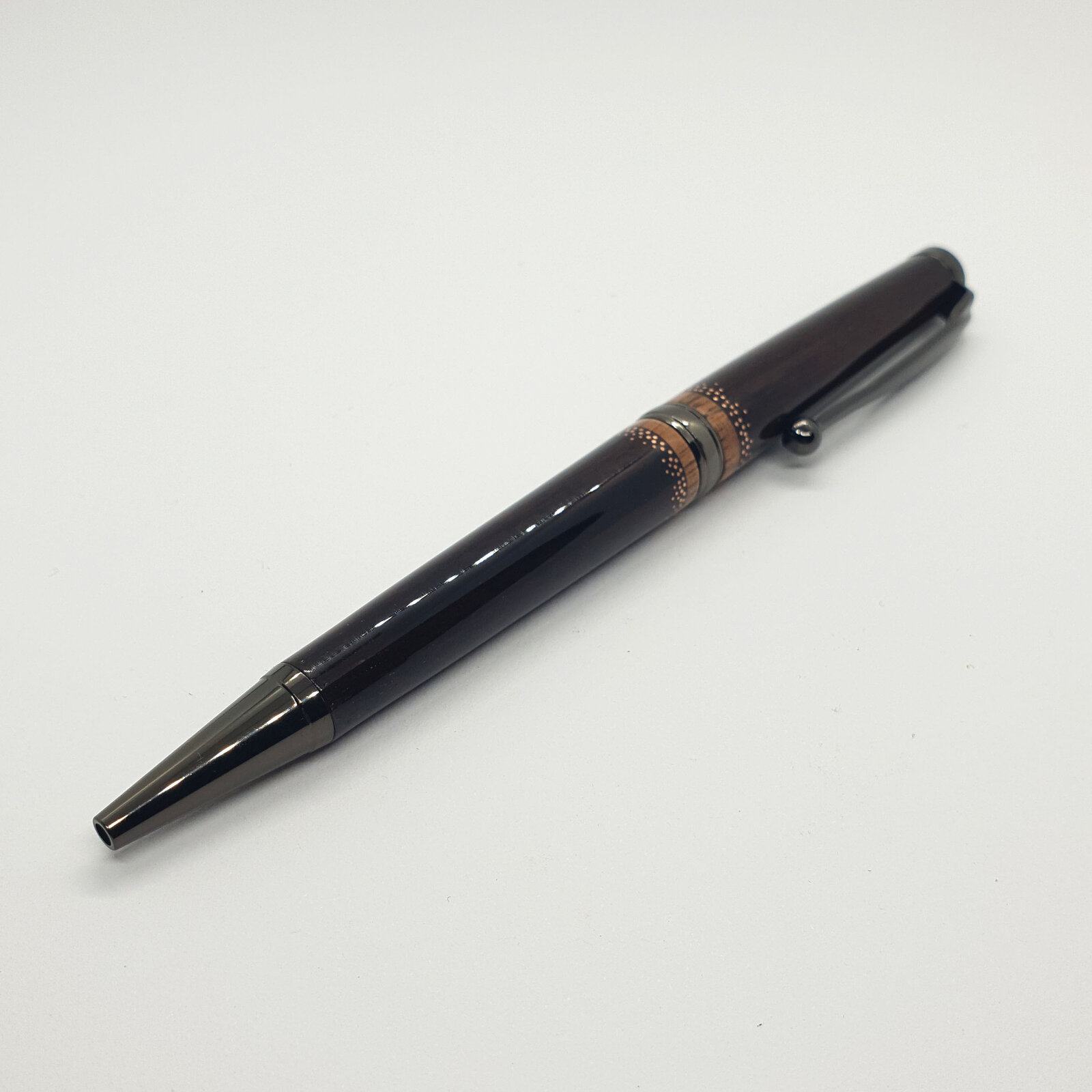 here is a ballpoint pen I made for my brother a few days ago. It was made using rosewood, walnut, and I made a wire inlay around the center ring to make it the highlight of a pen. Kit parts are in gun metal, and the pen was finished with CA glue. What do you think?