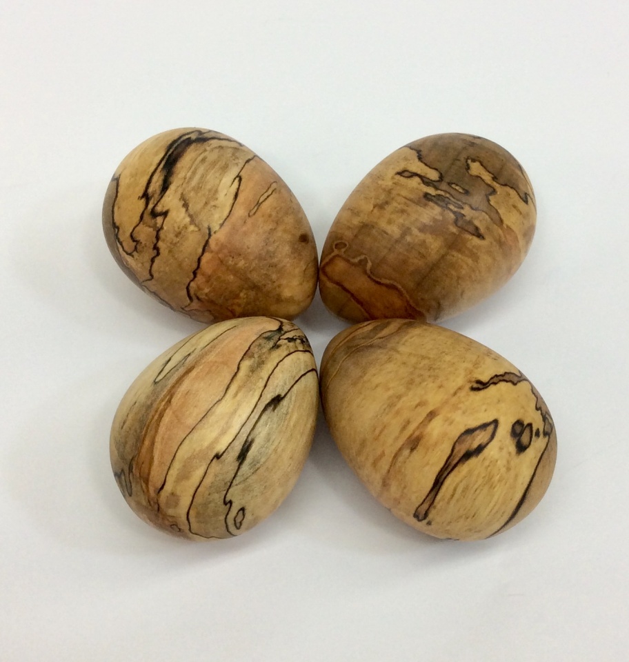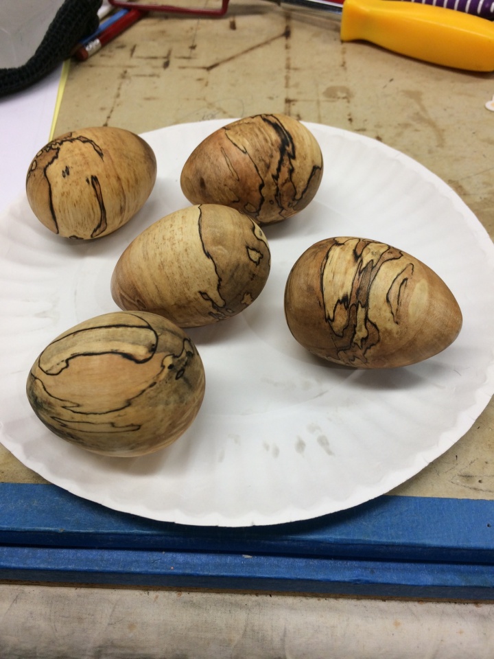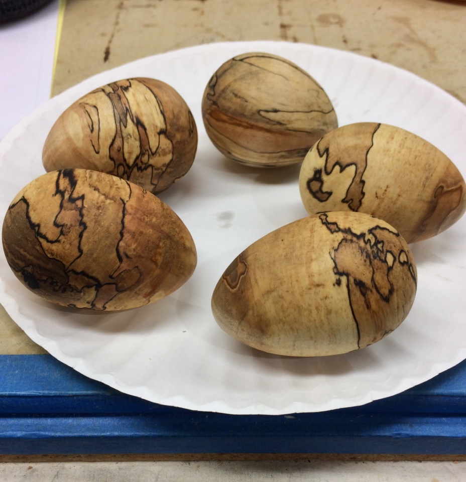 Here are some spalted maple eggs I turned yesterday. One is in traditional spindle orientation and the others are all turned in cross grain mode.
