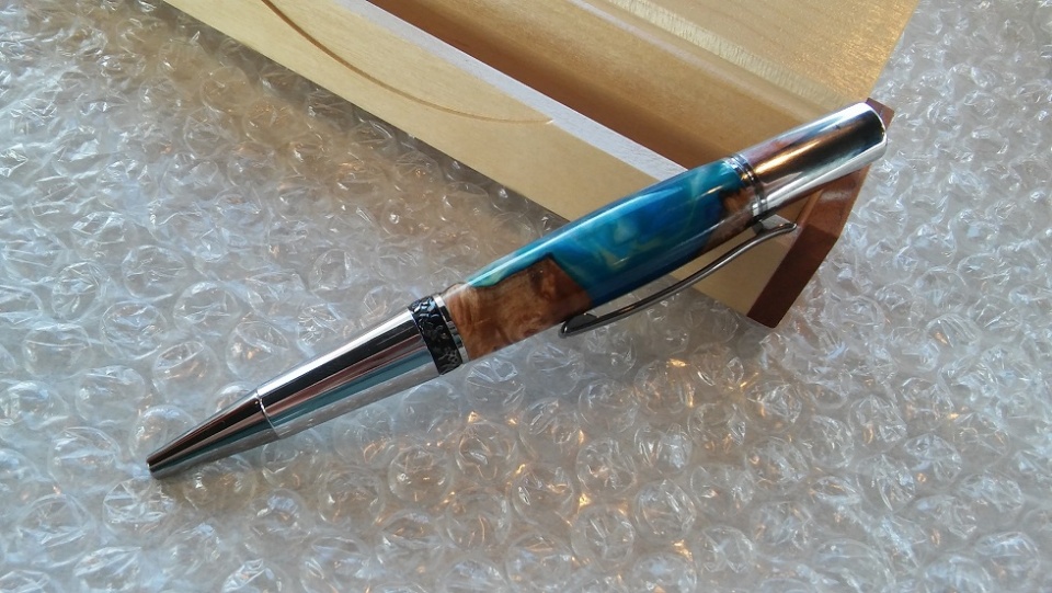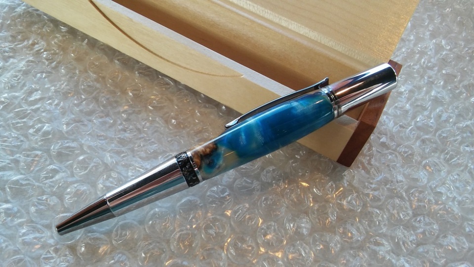 The kit is Craft Supplies Aero, Black Titanium & Chrome. Between Mom's favorite color being blue, and her living in Hawaii, the choice of which Fiji blank to get was pretty simple. The pics were taken with my cellphone at Taco Bell, before crossing the street to the Post Office to mail the package. Pen Box is from CSUSA, bubble wrap from ?? Had I been thinking a little better, I would have been on the OTHER side for taking the pics, with the window behind me, rather than beyond the pen.
