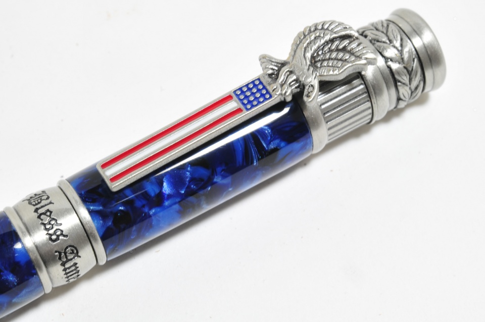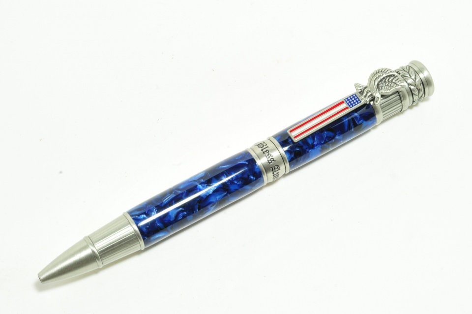 Here is one of 3 American Patriot pens I'm working on in antique pewter with vintage sapphire cebloplast material.