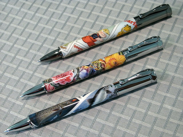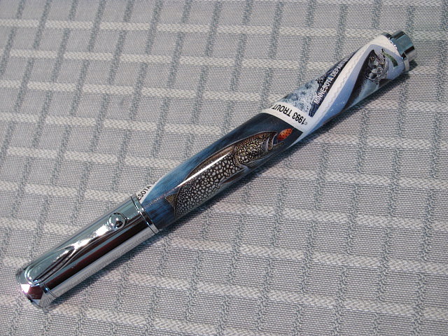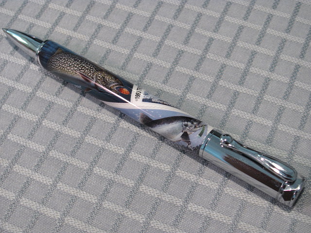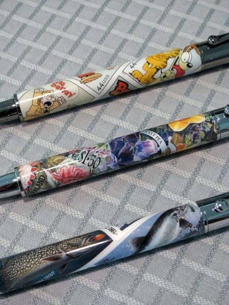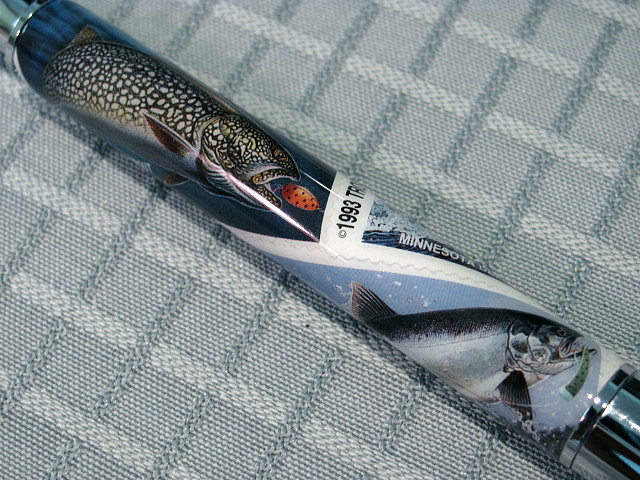 I had fun in the shop-ette this morning finishing up these 3 Zen stamp pens.I used stamps from New Zealand for the floral one,and .44 cent USA Sunday funnies stamps,and then on the last one I wanted a Minnesota pen,so I chose these neat Trout & Salmon license stamps.I hope everyone's having fun also out in the shop this weekend!