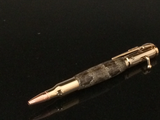 A gold bolt action pen with a prairie rattle snake pen blank from rsjimenez. Ramon, great job on the blank. The next one will be with gunmetal bolt action. Which one do you prefer? Comments and critiques welcome.