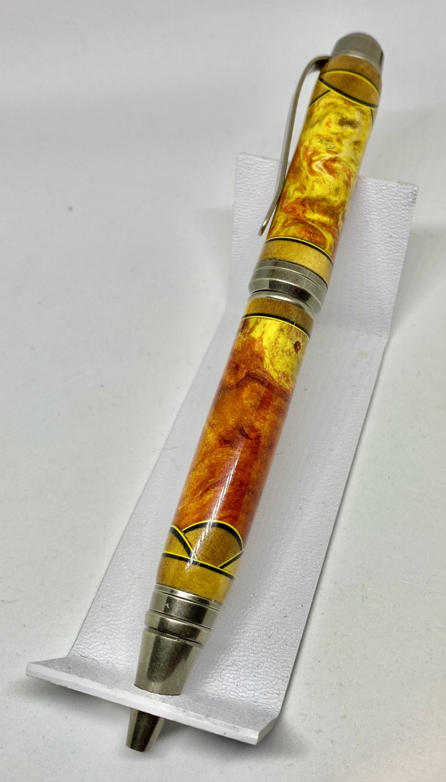 I made this pen for a demo on making scallops on pen blanks. The blank is a red and yellow, double-dyed Buckeye Burl with East Indian Satinwood for the scallops and end pieces. Black and yellow Gisi accents were used to provide separation between the main blank and the scallops/end pieces. The component set is from Turners Warehouse, a "No Black" Antique Silver Cigar.