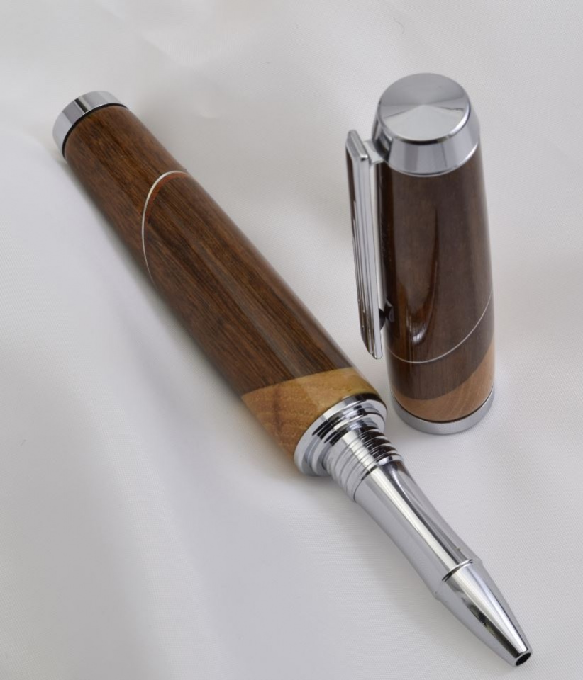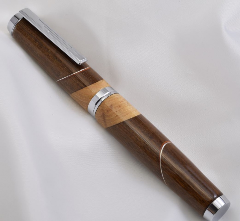 Made this from some scraps a friend gave me. I forget the main wood, but he used it for his deck. The piece in the middle is hickory. A couple of mistakes here, trying to figure out if i want to spend the time for a 'do over.' I have two ends that are a little rounded/undersized, but i didn't clear the CA off the top of the cap, and it separated a little in one spot