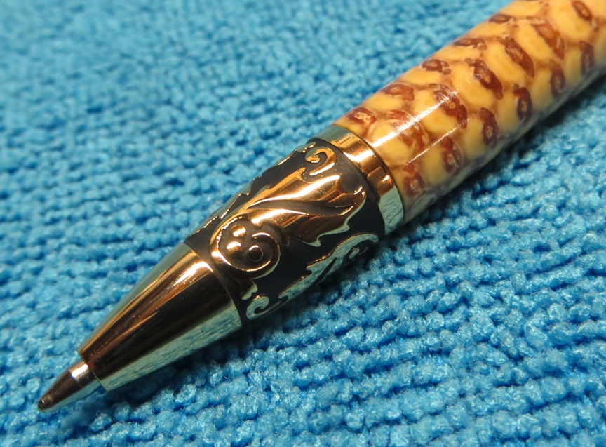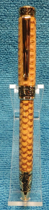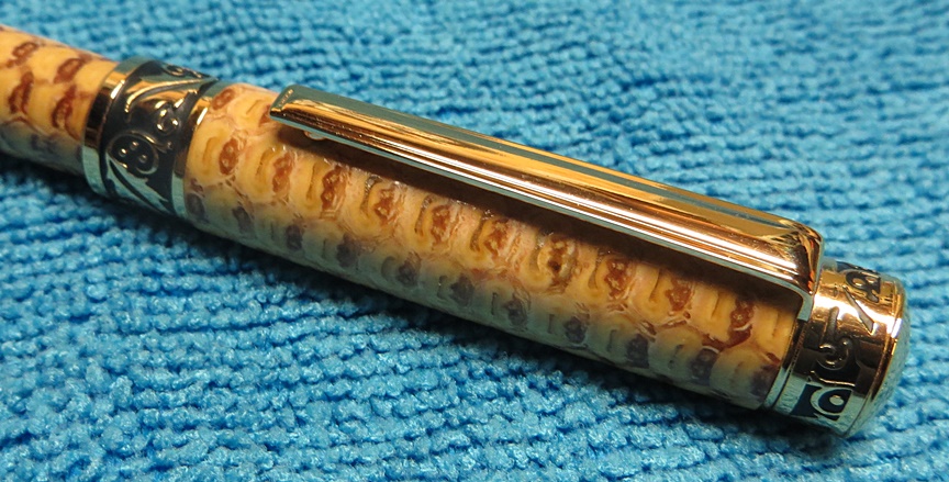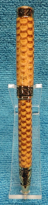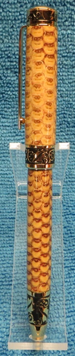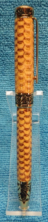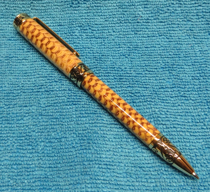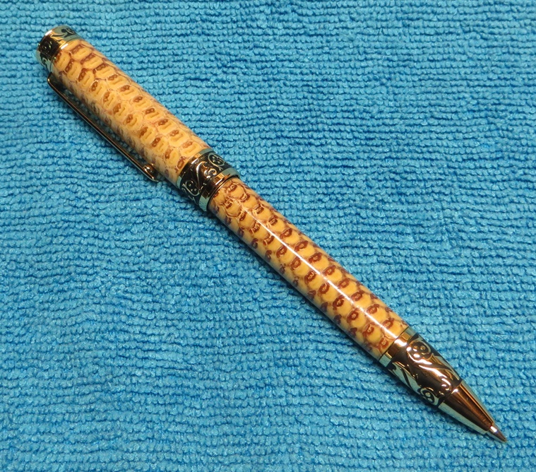 This is my first corn cob pen. The corn cob is stabilized from Exotic Blanks. The pen is a Sculpted Arbor from PSI. It's basically a fancy flat top pen. This is only my second CA finish, and the first was on antler. I didn't polish the antler, I only applied CA to seal it. I applied several light coats of CA to this one. I dry sanded it with 320 and 400 grit. Then wet sanded it with MicroMesh and polished it with Meguiar's PlastX. I made this for my mother who LOVES corn on the cob. Unfortunately, she can no longer eat corn since she developed ulcerative colitis. I'm very happy with how it turned out, and I think she'll get a kick out of it.
