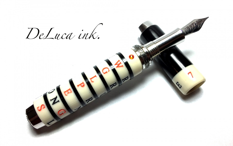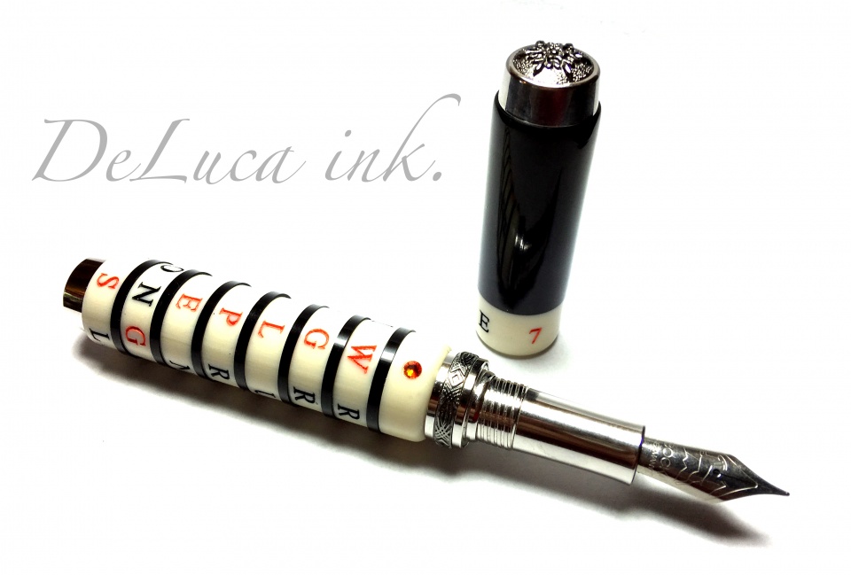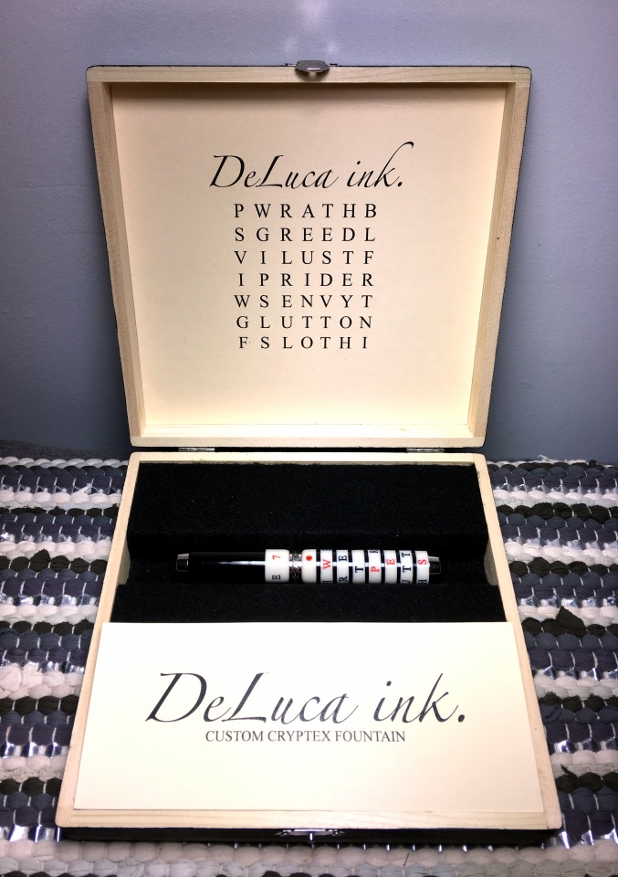 As Promised, here is another!! M3 Black Lava (Hate that stuff) and Alt Ivory combo with black and flame orange color fill. Laser engraving courtesy of Eric (Sylvanite). Swarovski Flame Opal Crystal and a Bock 6mm Polished nib. This pen was built around the concept of seven deadly sins so the rotating rings are: Wrath, Greed, Lust, Pride, Envy, Glutton, and Sloth. Didn't even plan for the word PENS to be able to line up but hey, ill take it. Box stained black with custom foam and felt insert and printed materials. There is a whole set of ink cartridges under the bottom paper flap along with her pen info cards.Questions and Comments Welcome.