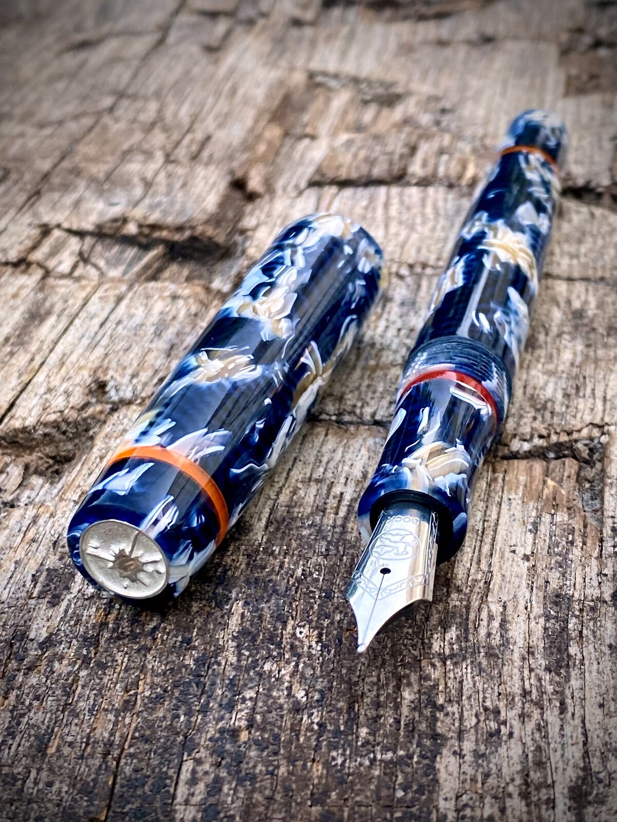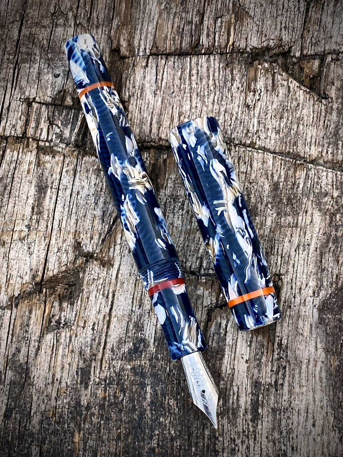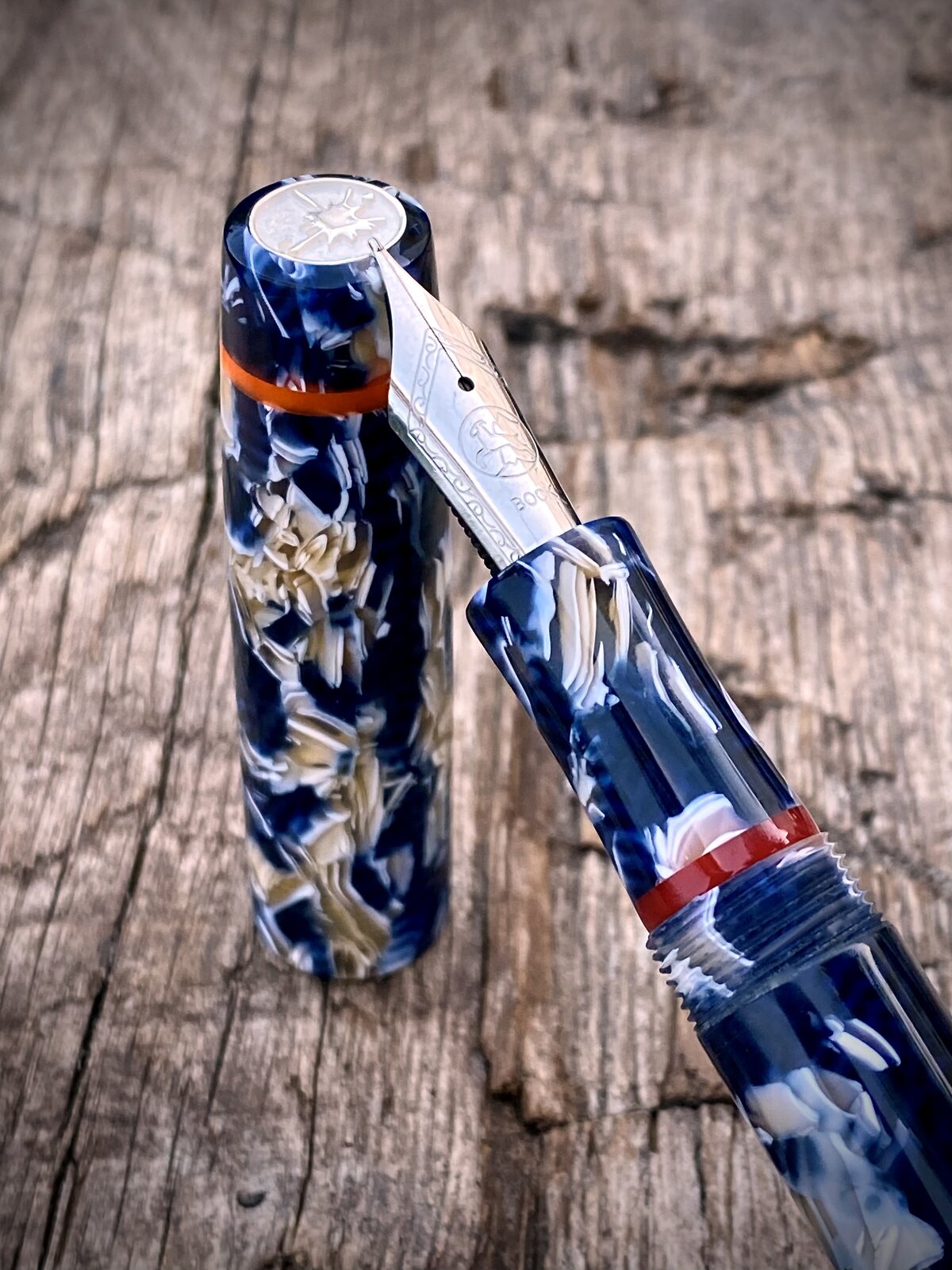 The pen is a cellulose acetate with orange and red accents. The nib is a Bock no6 and it is my step-less model (no lip between the 13mm triple lead cap threads and rest of the barrel).