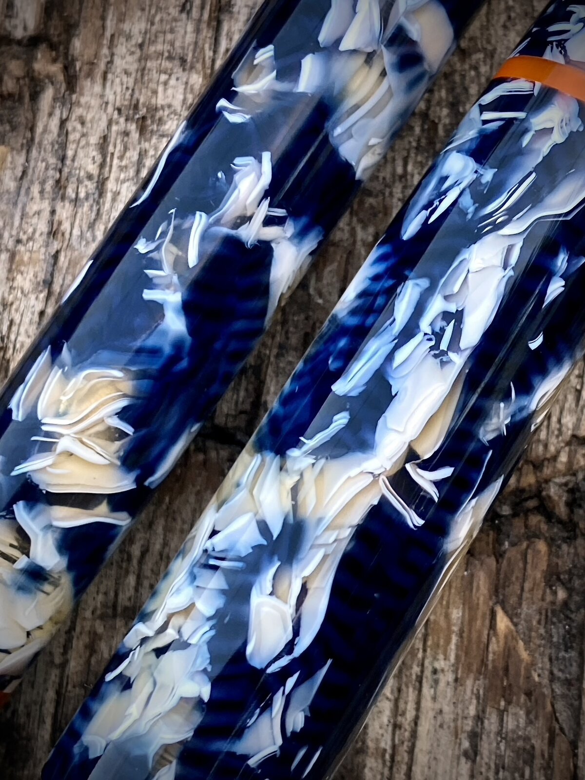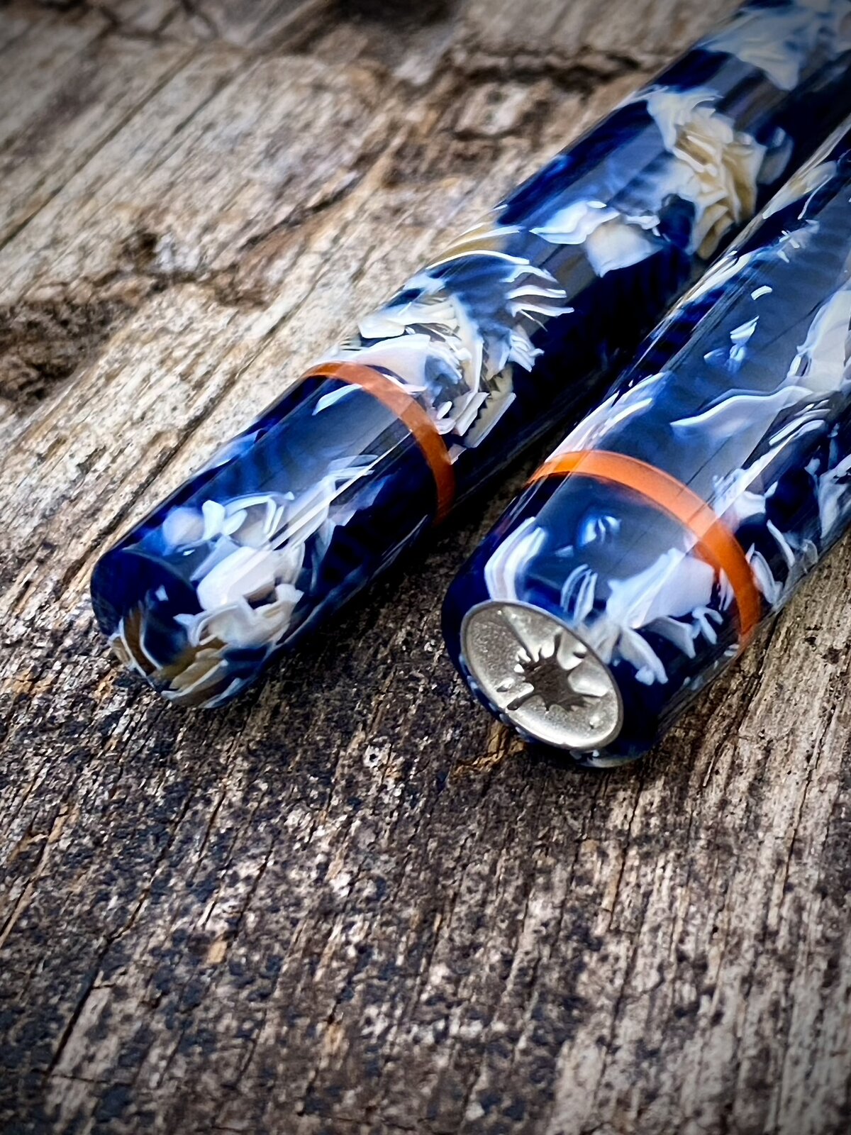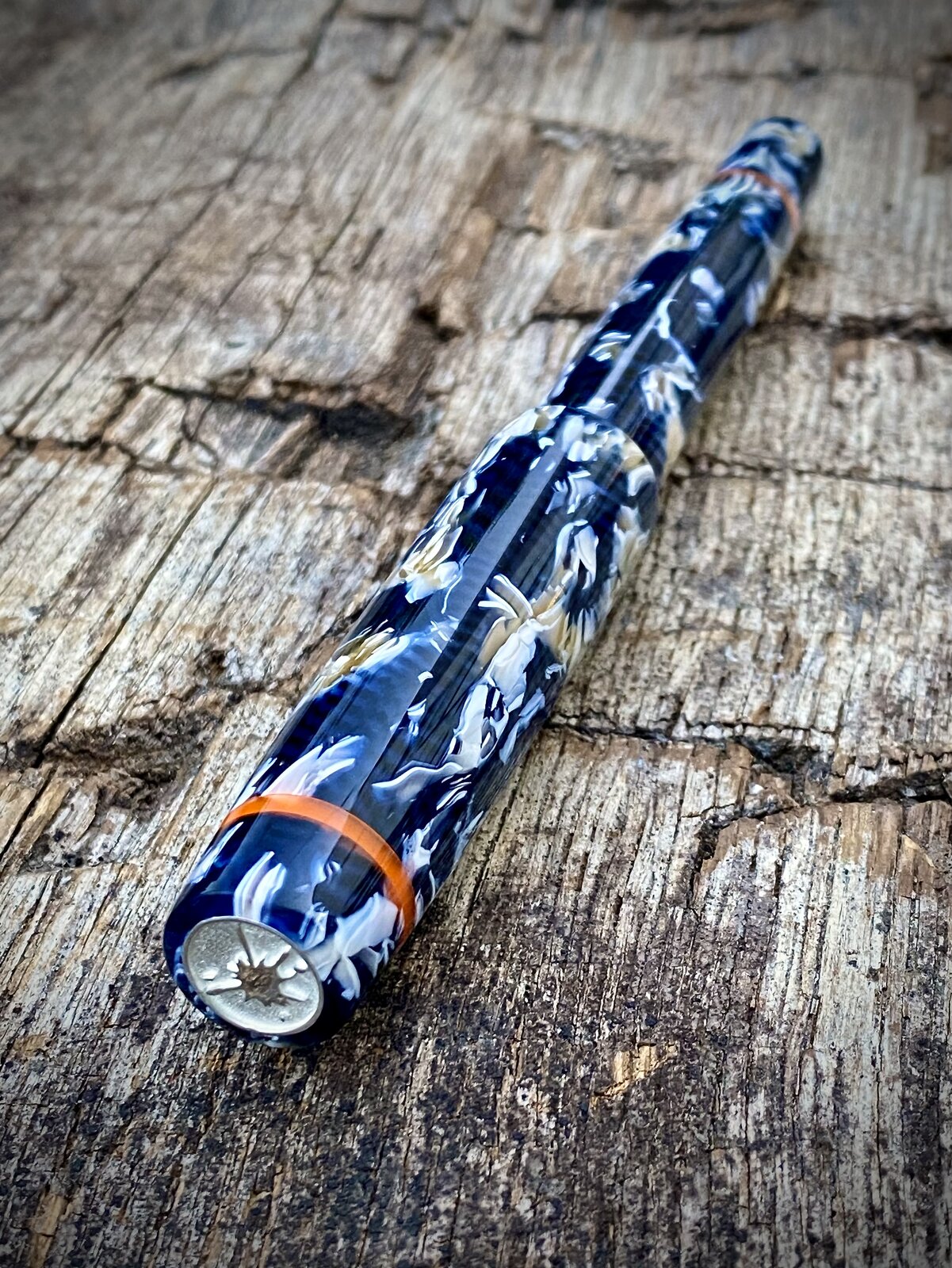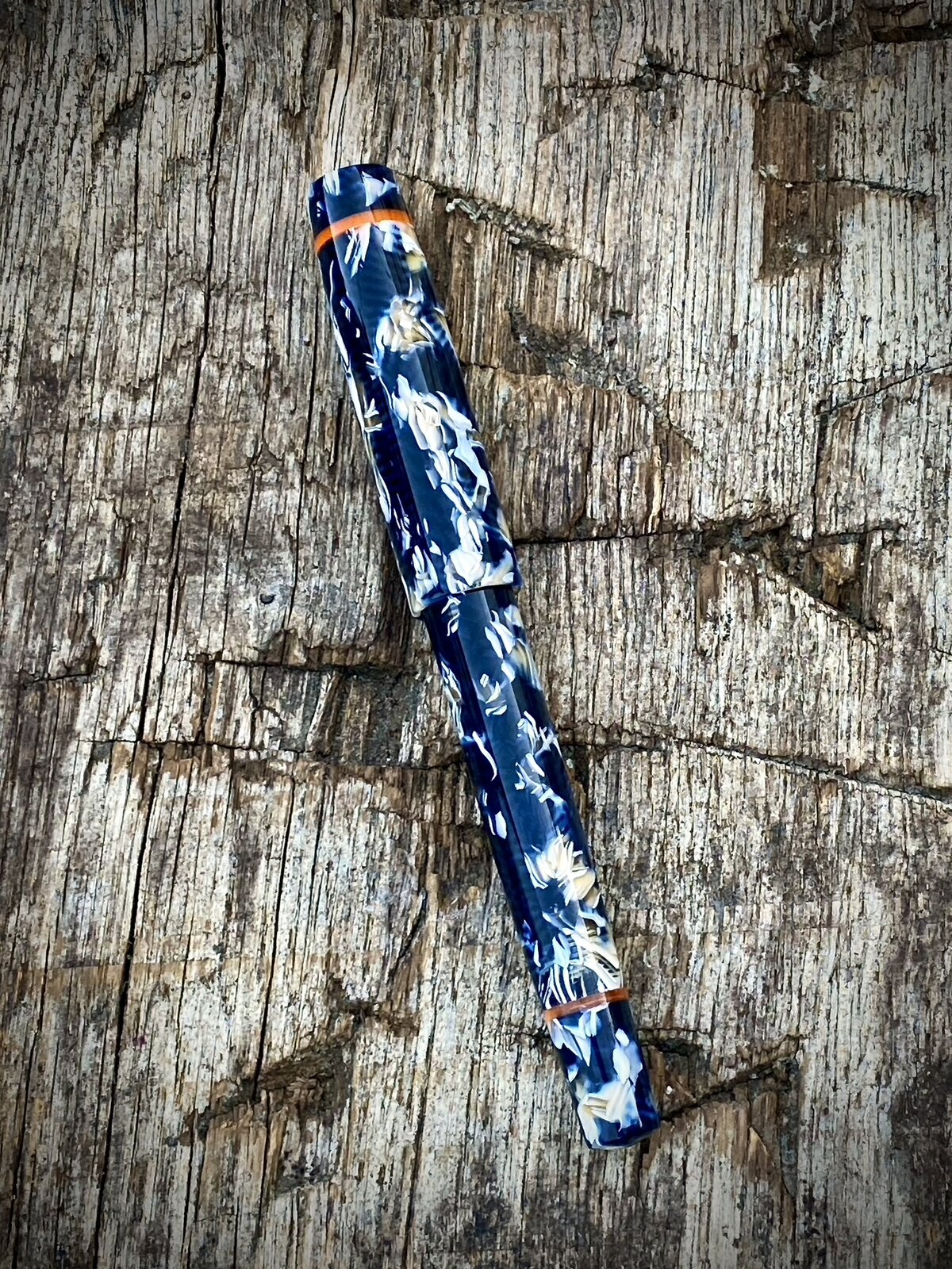The pen is a cellulose acetate with orange and red accents. The nib is a Bock no6 and it is my step-less model (no lip between the 13mm triple lead cap threads and rest of the barrel).