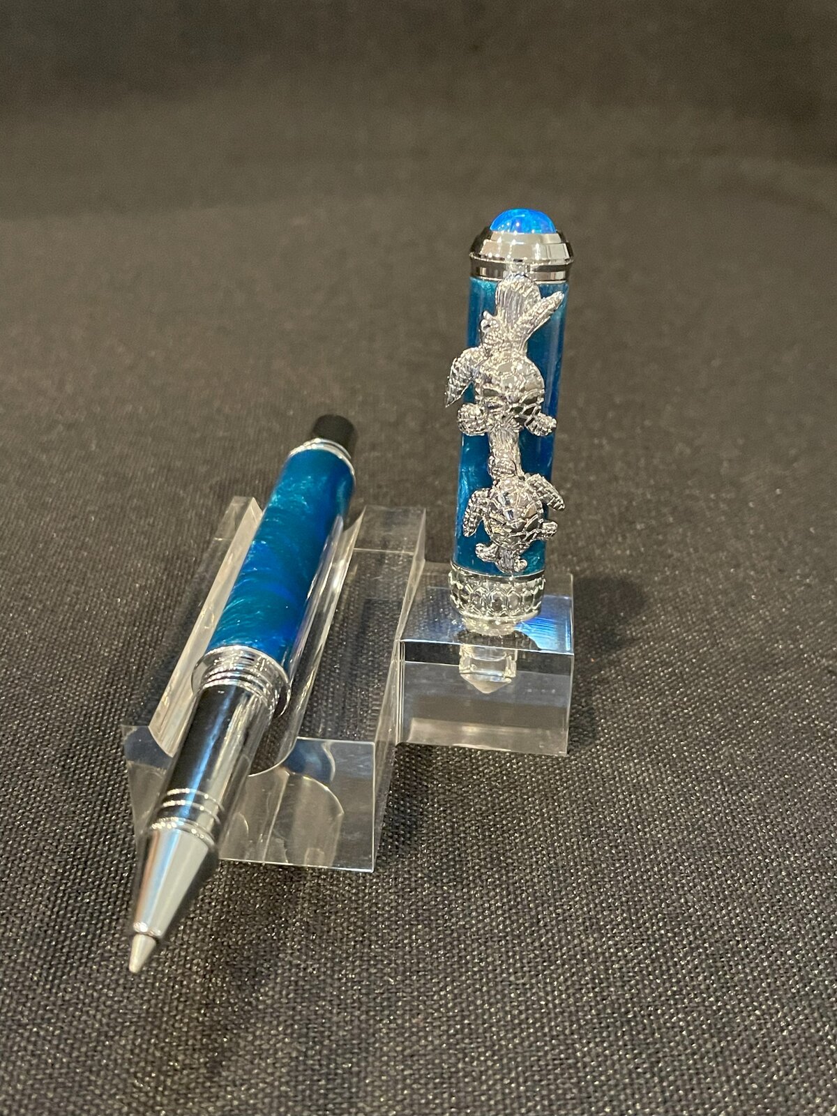 The pen is from Woodturningz and the blank is called Blue Brava made by MuttBlanks and I got it at Exotic Blanks. The cabuchon on the cap was on the cap when it arrived at my house, the blank matched it really well.