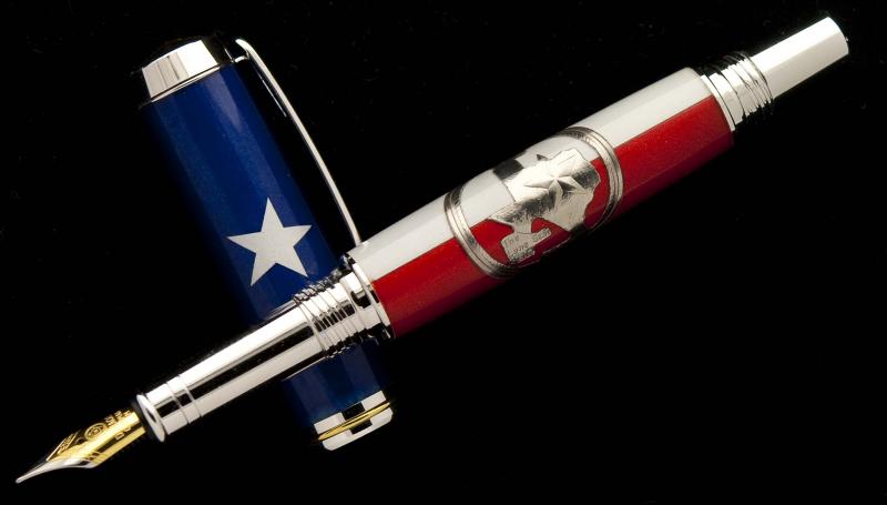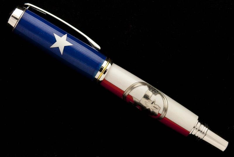 Made it this A.M. It's one of Seamus's Texas Blanks on a Rhodium Jr. Gentleman Fountain Pen. Was fun making it. Had difficulty with photographing it as the coin wraps around the pen and it was also difficult to use a red, white or blue background. Sorry for the dust on the pictures. It's a beautiful Texas pen....and I ain't selling it or giving it away...yup ..and that's that.:wink:. Doc