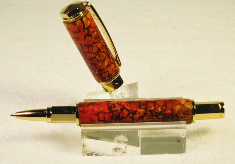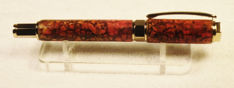 This is my second pen using egg shells as a base on my tubes. Pen is a PSI magnetic Vertex with Gold fittings. I did this one a little different than the first by turning larger Maple barrels so I could build up a CA finish instead of having to cast PR over the shells. Cuts out a few steps and gives me more controll of the final finish on the pen. Egg shells, after being soaked in bleach overnight, are applied to Maple barrels with Tacky Glue, filed and sanded to 1200. A green Alcohol Ink was applied as a base coat, followed by a watermellon colored Ink, and a light sanding to bring out some lighter portions of the shells. Finished with a buldup of thich CA ti bring the pen to the correct size. Jim S