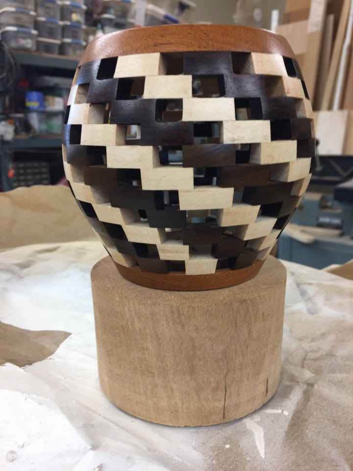 I use lot of jigs for cutting, sanding and jig for putting the segments rings together. Major problem is keeping the vessel in axis alignment.