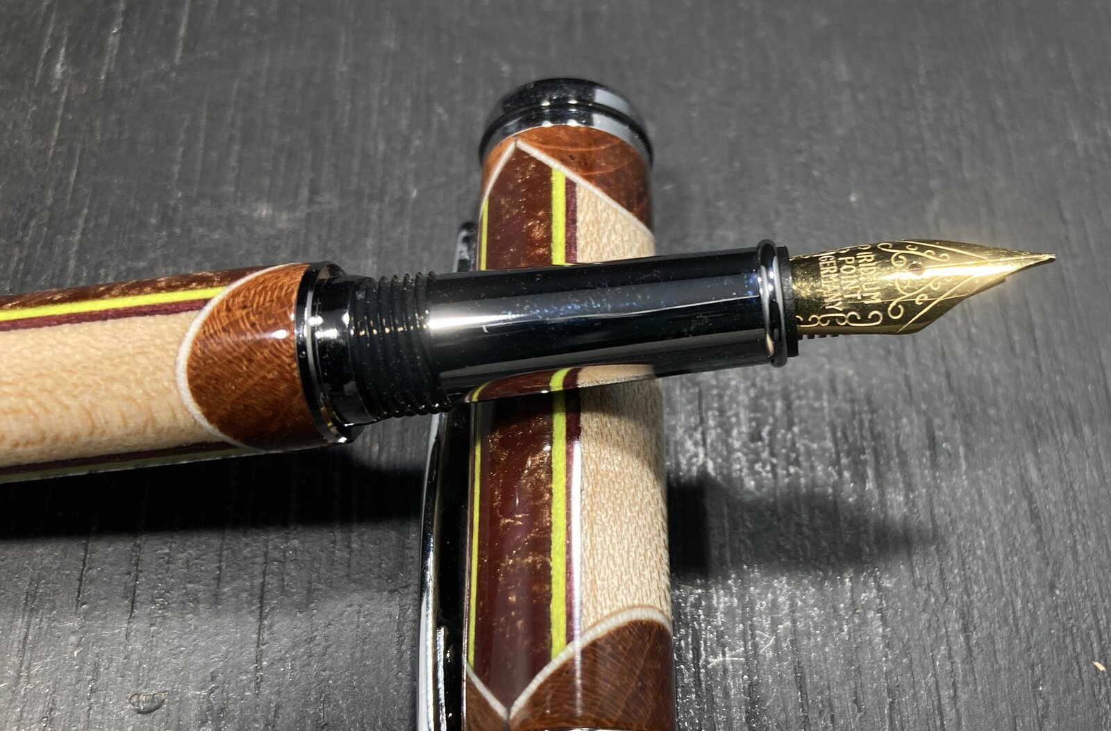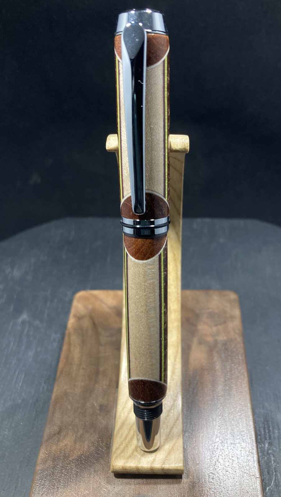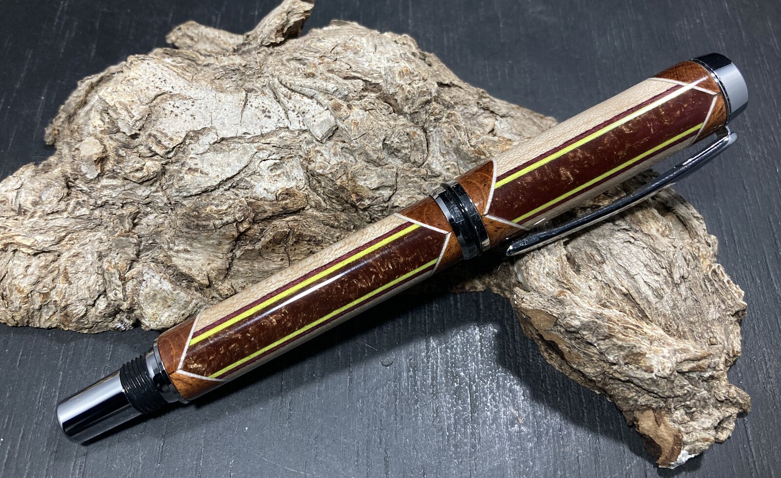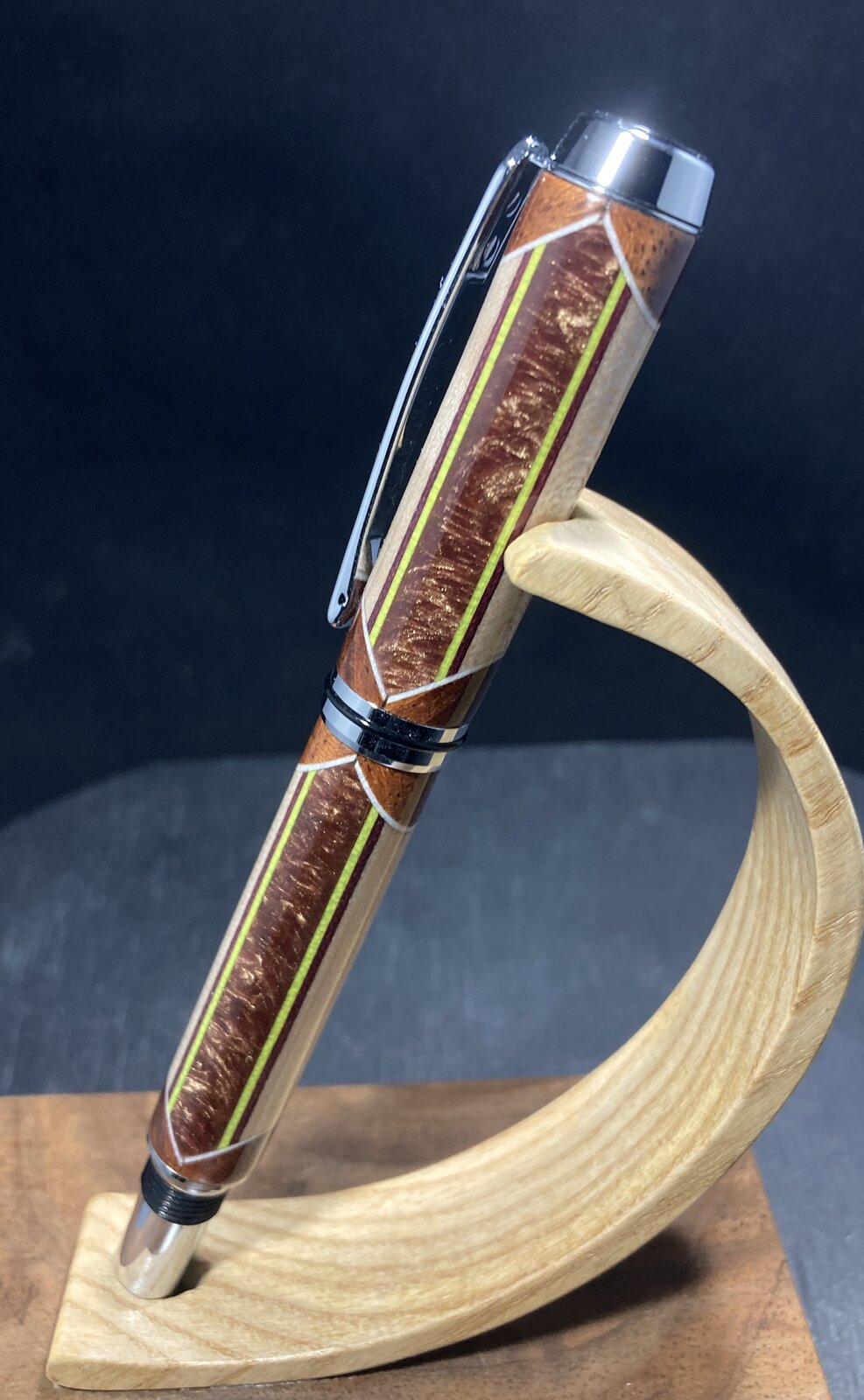 I really enjoy segmenting, as there is a lot more work going into the blank, and a lot of directions you can take as you go about building the blank. I added some neon yellow veneer strips to this pen, just because. I like the splash of color. The center segment is actually a resin I cast last year - it's sort of a bronze/gold, but it has some "depth" (chatoyance?) to it.