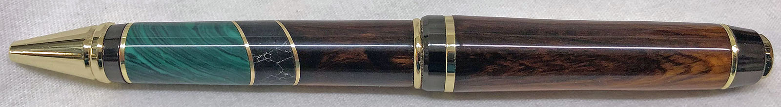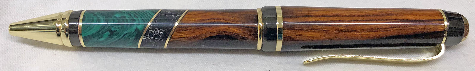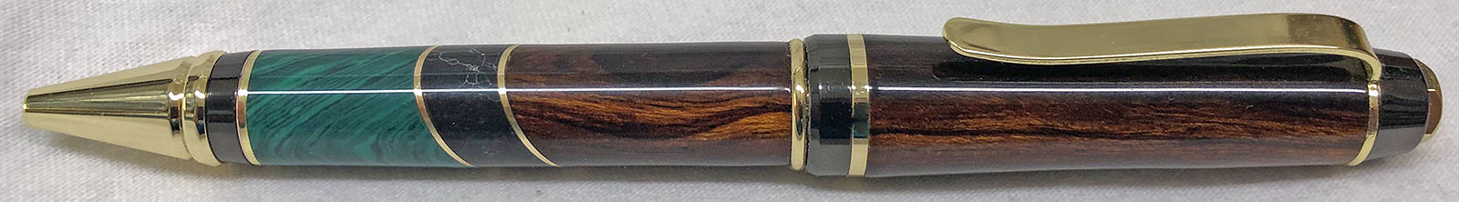 Today I pulled out a segmented blank that I've had for quite some time. It is Sonoran Desert Ironwood with simple segments made from SimStone Malachite and Black Marble with brass strips as separators. The kit is a Gold and Gunmetal Cigar. It is hard to tell the difference between a standard Gold and Black Plastic kit because the Gunmetal is really dark. I used my standard CA and MicroMesh regimen.