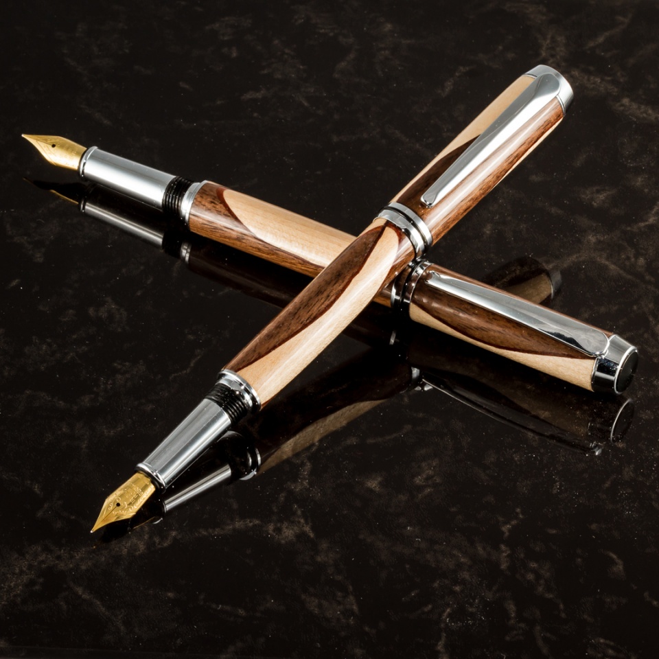 These are two segmented pens I made for coworkers. It was my first try at this kind of segmenting, but I think it worked out OK. The wood is maple and walnut with a mahogany veneer in between, and these are the two brother or sister blanks that came from this kind of segmenting with a scroll saw. The kit is a Baron that I bought from Lee Valley while they were running a free shipping promo a few weeks ago.