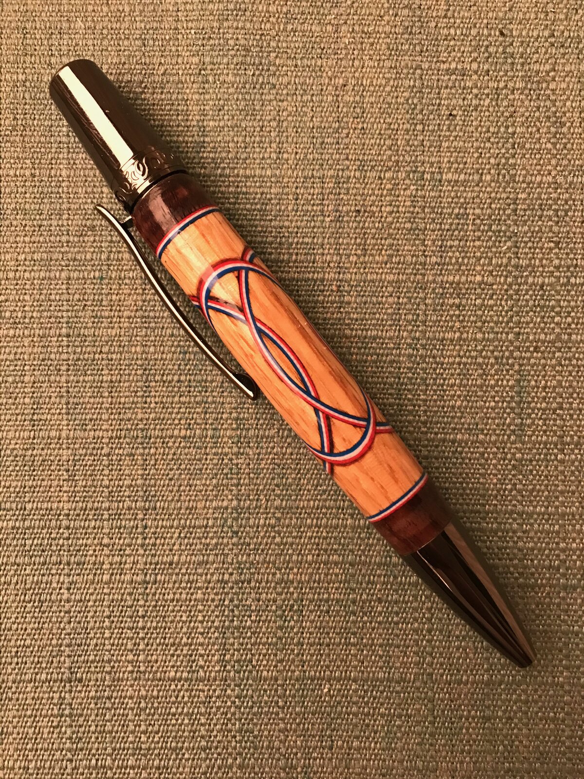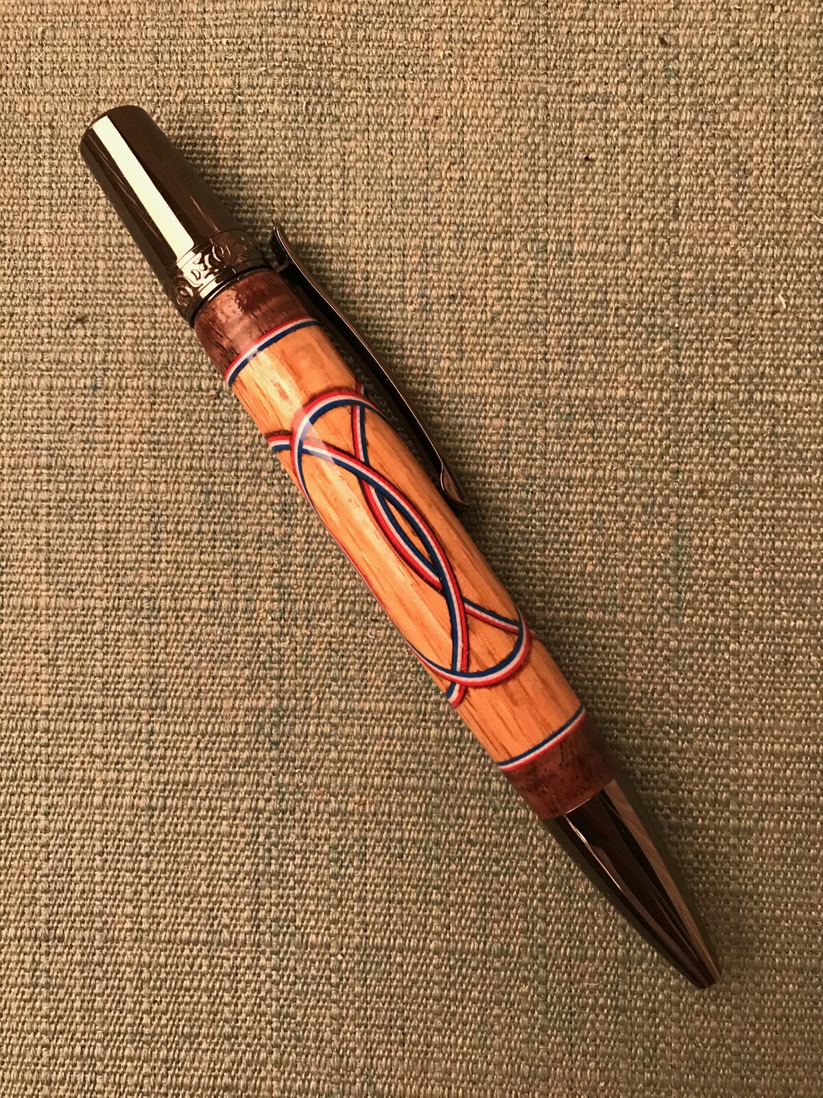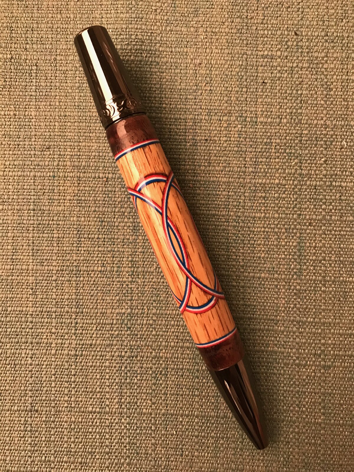 Found that I could use a carbide or Diamond hole saw and use the Gabe Castro jig to make this pen. Blank was just a scrap chuck of white Oak with Walnut being the end caps.