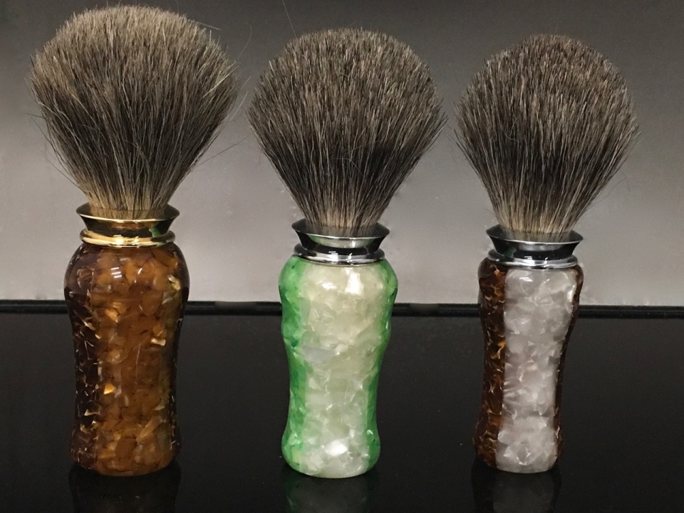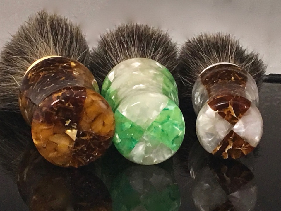 The one on the left is coffee and espresso, the center is ice and lime, the one on the right is ice and espresso. These are all lucite/matrix blanks. The first photo shows one of the colors head on, the second photo shows it rotated, and the last one is how they were glued together.