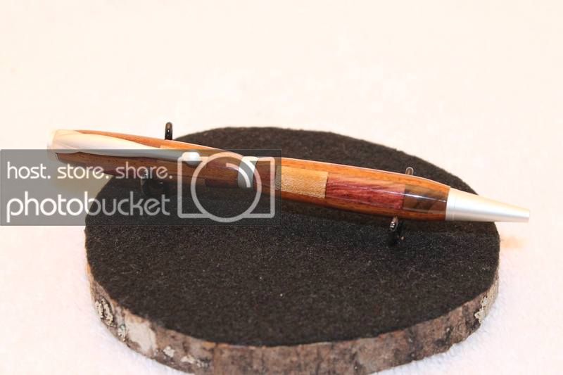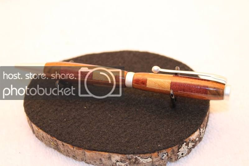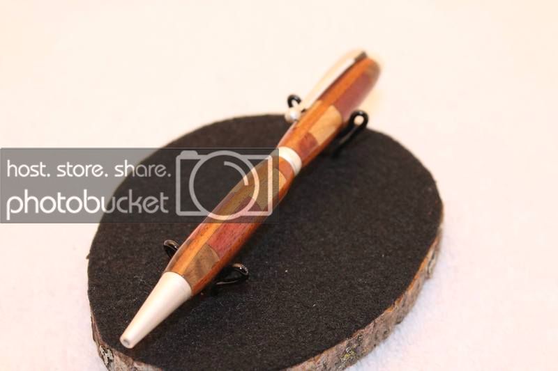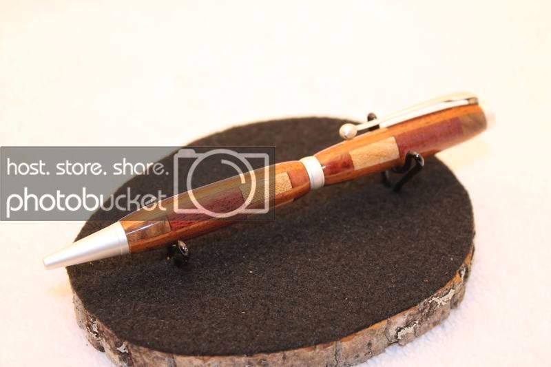 I think (not sure at this point) I used Honduran rosewood, maple, purpleheart, and amboyna in the stack. the verticle segment was a thin strip of andiroba. I picked up a bunch of VERY cheap Andiroba from woodcraft about a year ago.