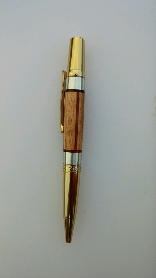 Excellent Pen Don, Great Segmented Blank from George, FYI I think it is Golden "Wattle" not Waddle :wink: :redface: Beautifully Turned, Fitted and Finished. Congratulations, Brian.