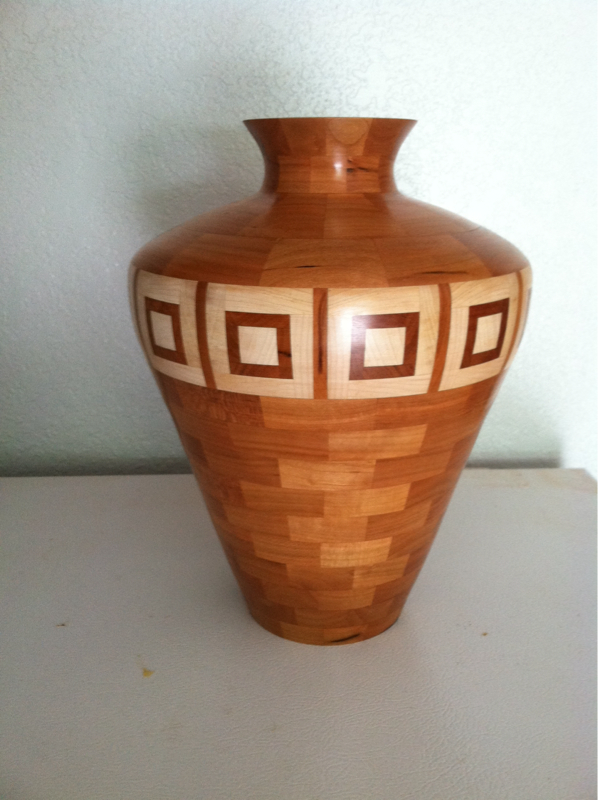 This is my very first segmented vase. It has 14 rings with 12 segments each ring. The feature ring has 120 pieces in it. There is a total of 289 pieces in the vase. It's about 14 inches tall and just over 9 inches in diameter. It is made of cherry and maple with a friction polish finish. The photo is not the greatest it's too big to photo in my light box so I snapped this pic with my phone.
