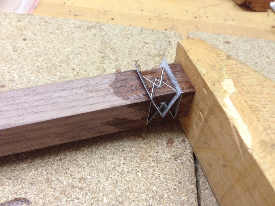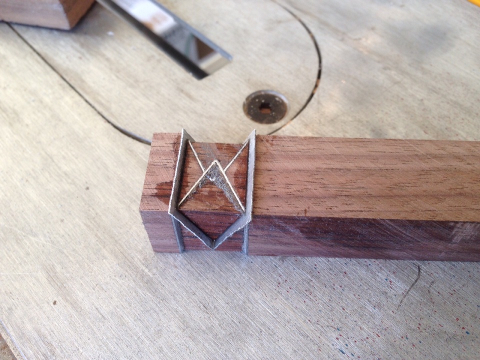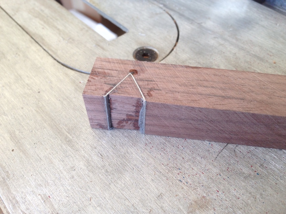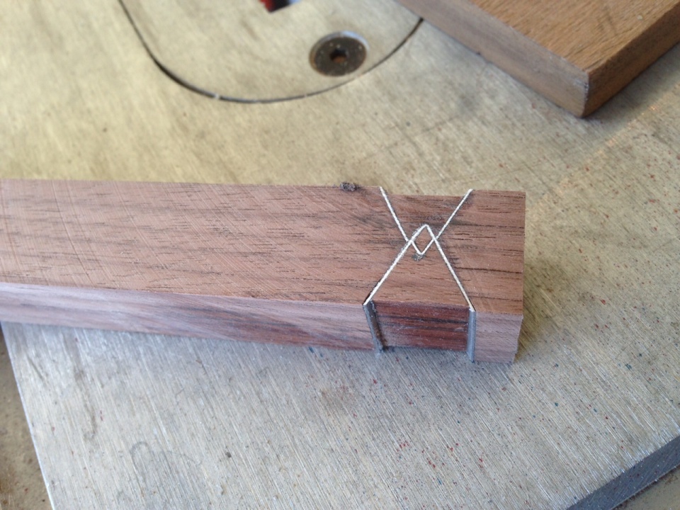 I set up my bandsaw for 40 degrees (I think) and installed a stop-block so all of my subsequent cuts would be identical. You will have to get creative on how to do the V cut sideways since one stop-block will not work for both side of the V. If I come up with a good way to do this one the next piece, I'll post it, or if someone else already has a good method you can share it with us all!